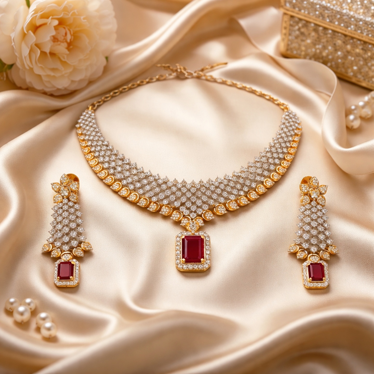 A majestic bridal necklace set crafted with shimmering lab-grown diamonds in a rich layered choker design, highlighted by a bold rectangular colored stone pendant. The intricate diamond detailing and matching colored stone drop earrings create a regal, statement-making look perfect for grand wedding celebrations and traditional bridal styling.