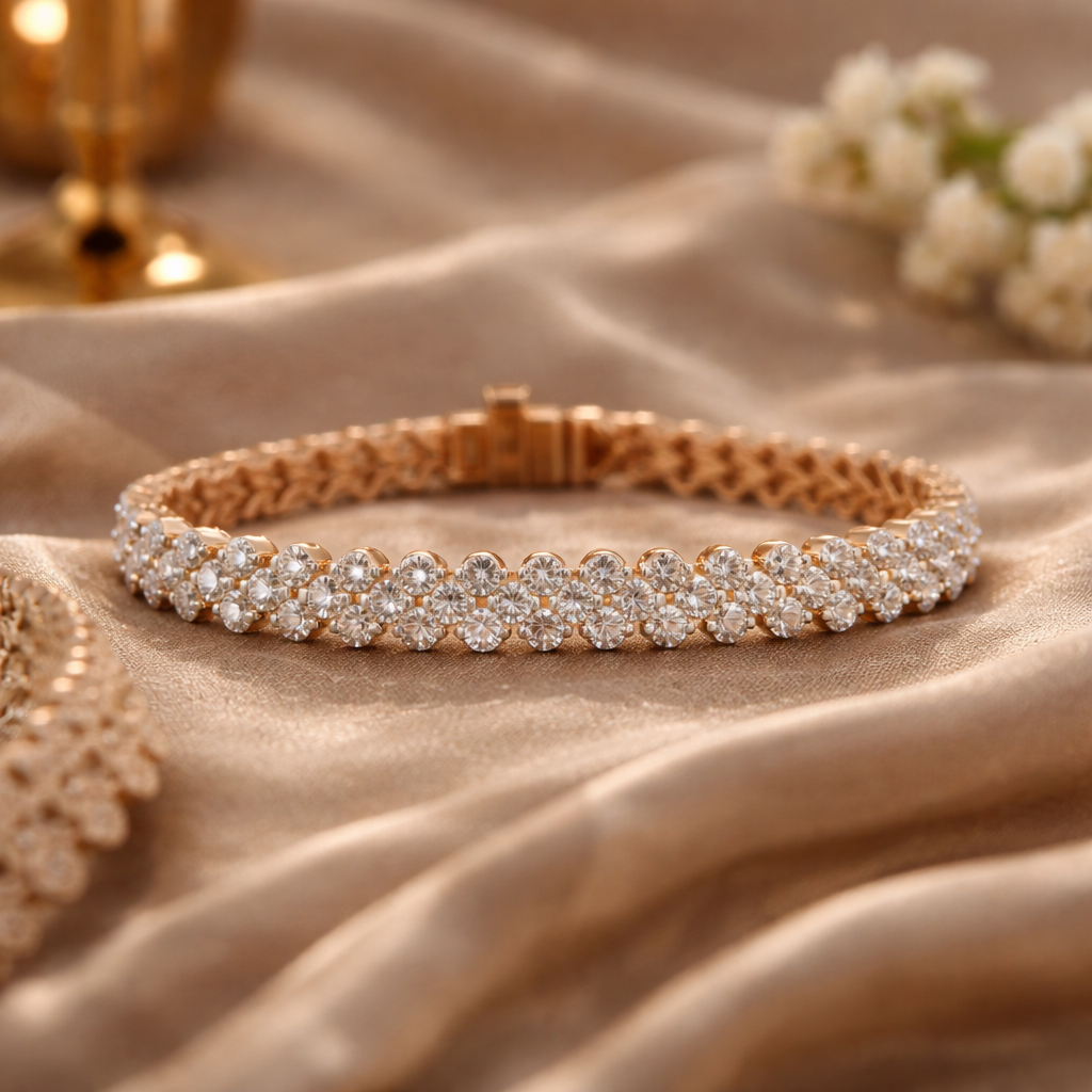 This elegant bridal bracelet features two shimmering rows of perfectly aligned round lab-grown diamonds, delicately set in a warm rose gold finish. The seamless design creates a continuous sparkle, offering a refined balance of brilliance and sophistication. Crafted for modern brides and special occasions, this bracelet adds timeless charm and radiant luxury to any ensemble while maintaining a graceful, lightweight feel on the wrist.