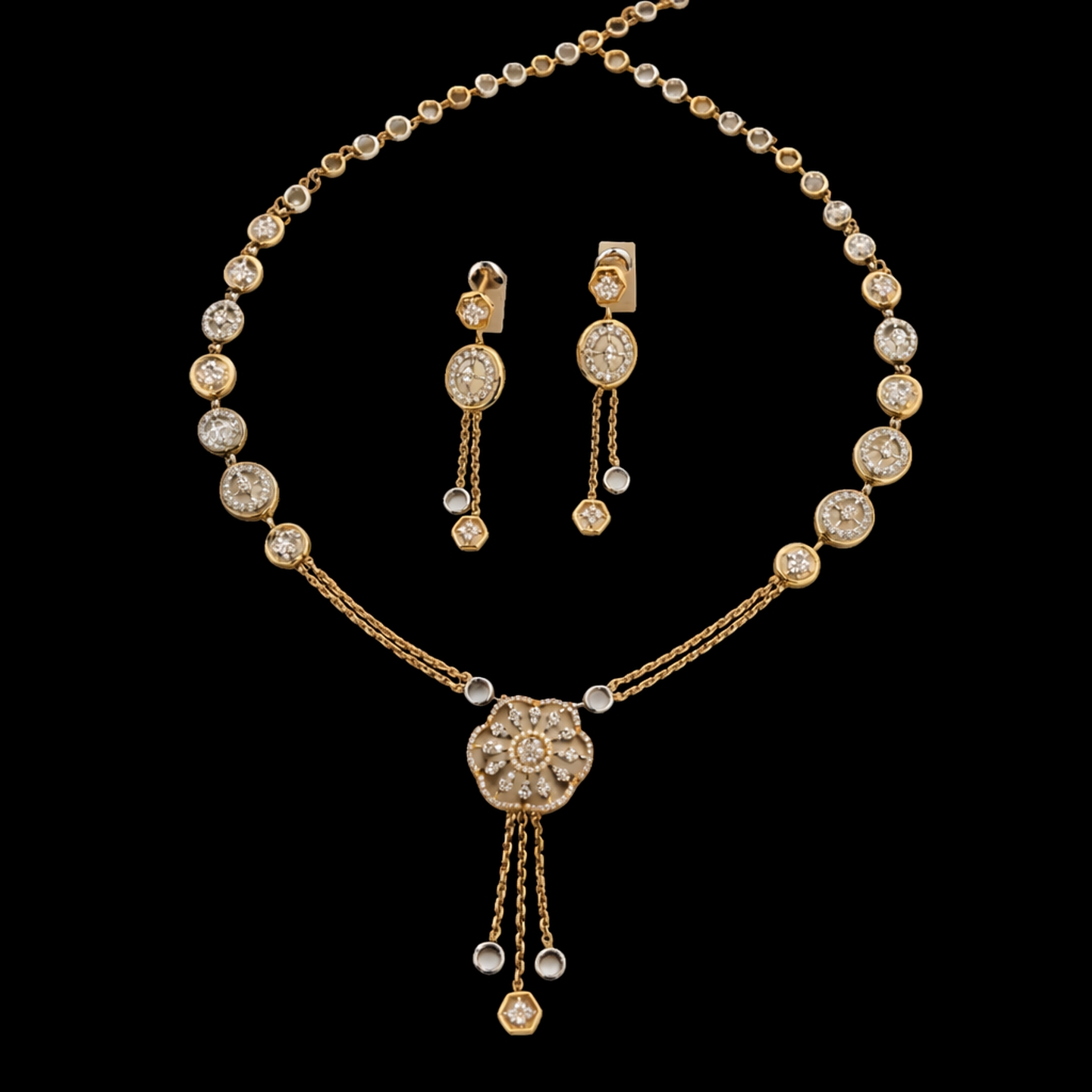 A graceful bridal necklace set featuring round floral medallion motifs adorned with sparkling lab-grown diamonds. The elegant chain arrangement flows into a detailed central flower pendant with delicate hanging drops, beautifully paired with matching drop earrings. The soft gold tone and intricate detailing create a timeless, wedding-ready statement with refined charm.