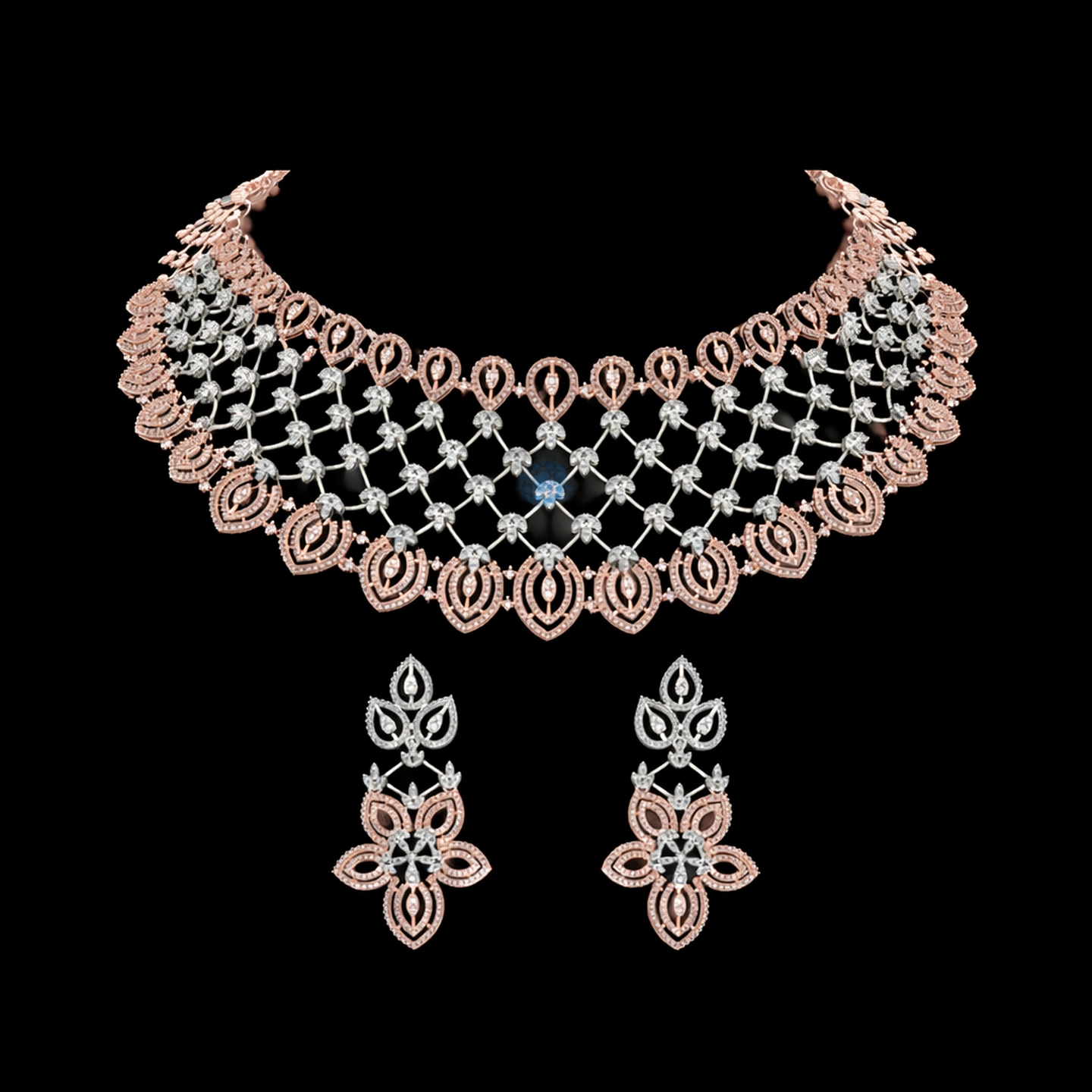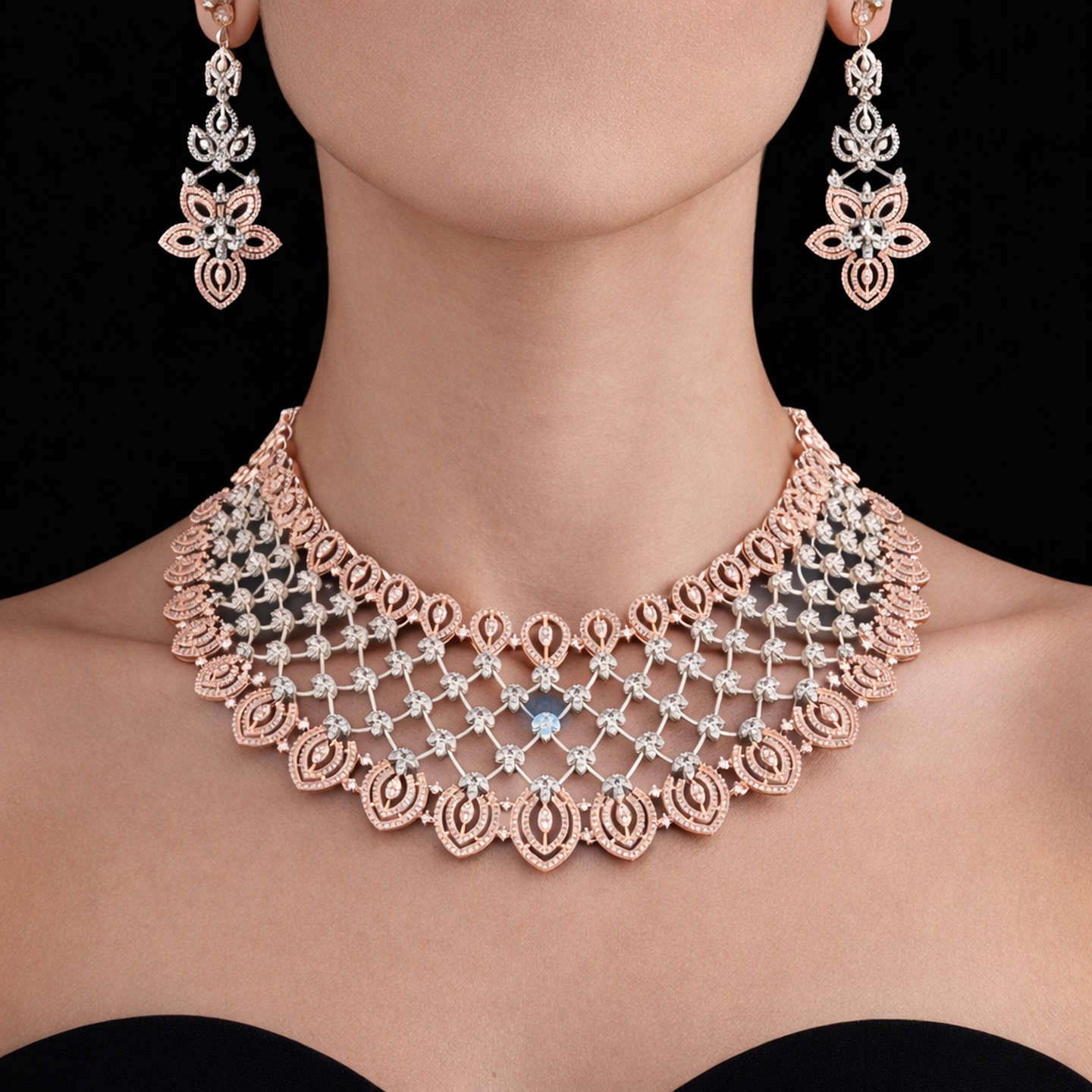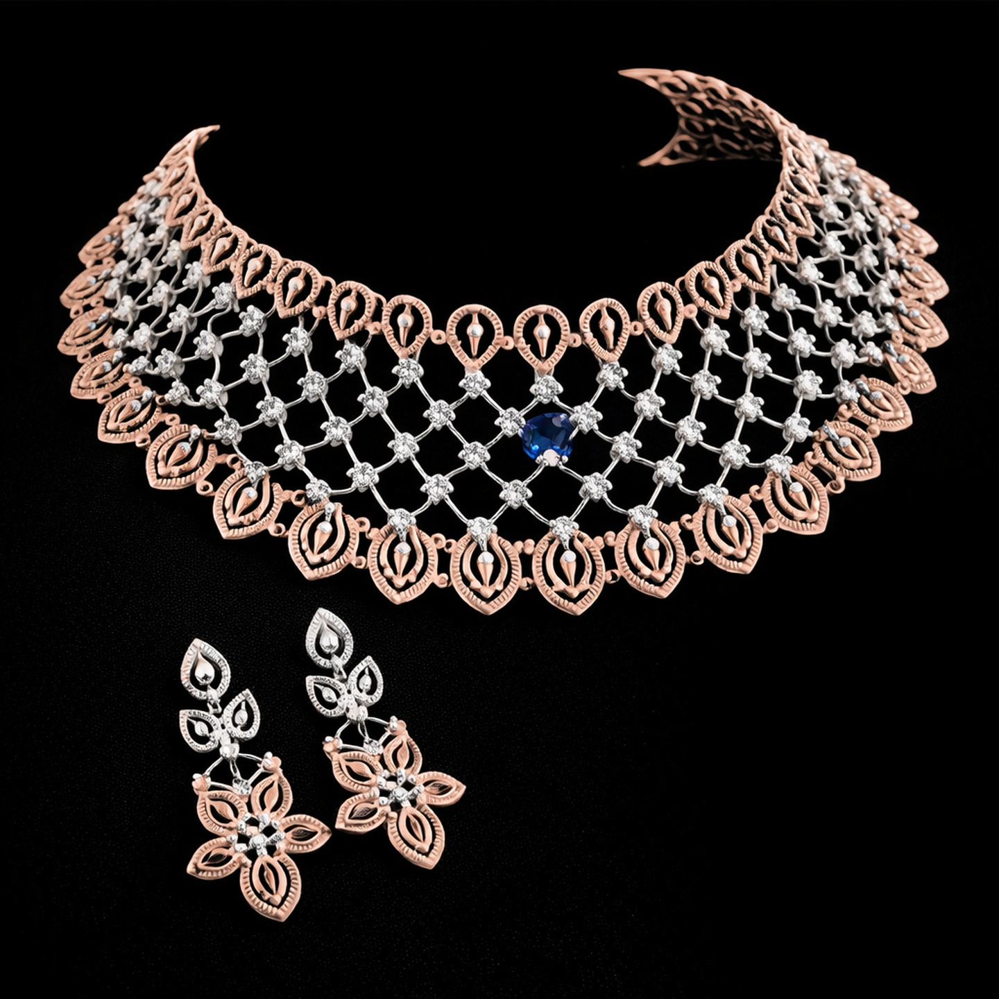 Elegant bridal choker set featuring a delicate diamond net design with heart-shaped frames, pear-inspired detailing, and a subtle blue center accent. Paired with matching statement earrings for a royal wedding look.