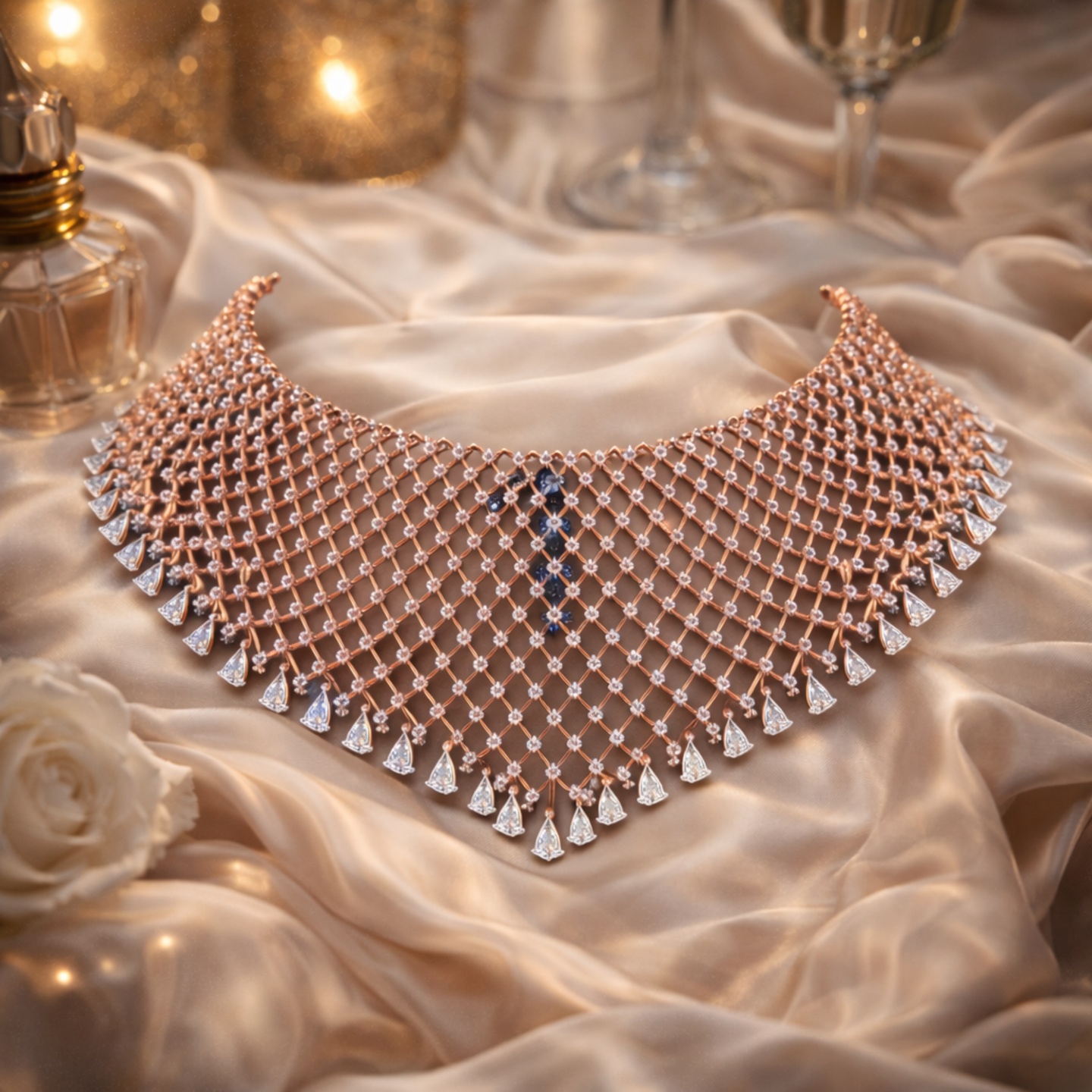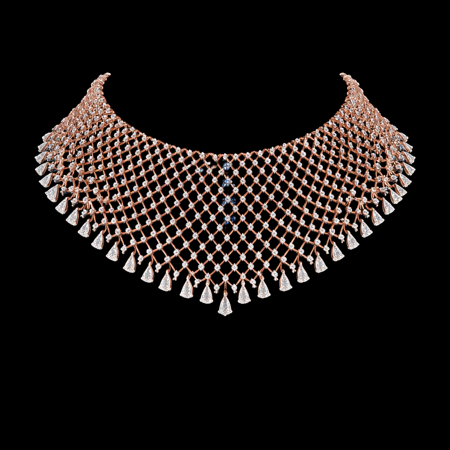 Luxurious bridal statement necklace crafted in a delicate diamond net pattern, adorned with pear-shaped lab-grown diamond drops and subtle blue stone accents. A grand design perfect for weddings and royal occasions. ???