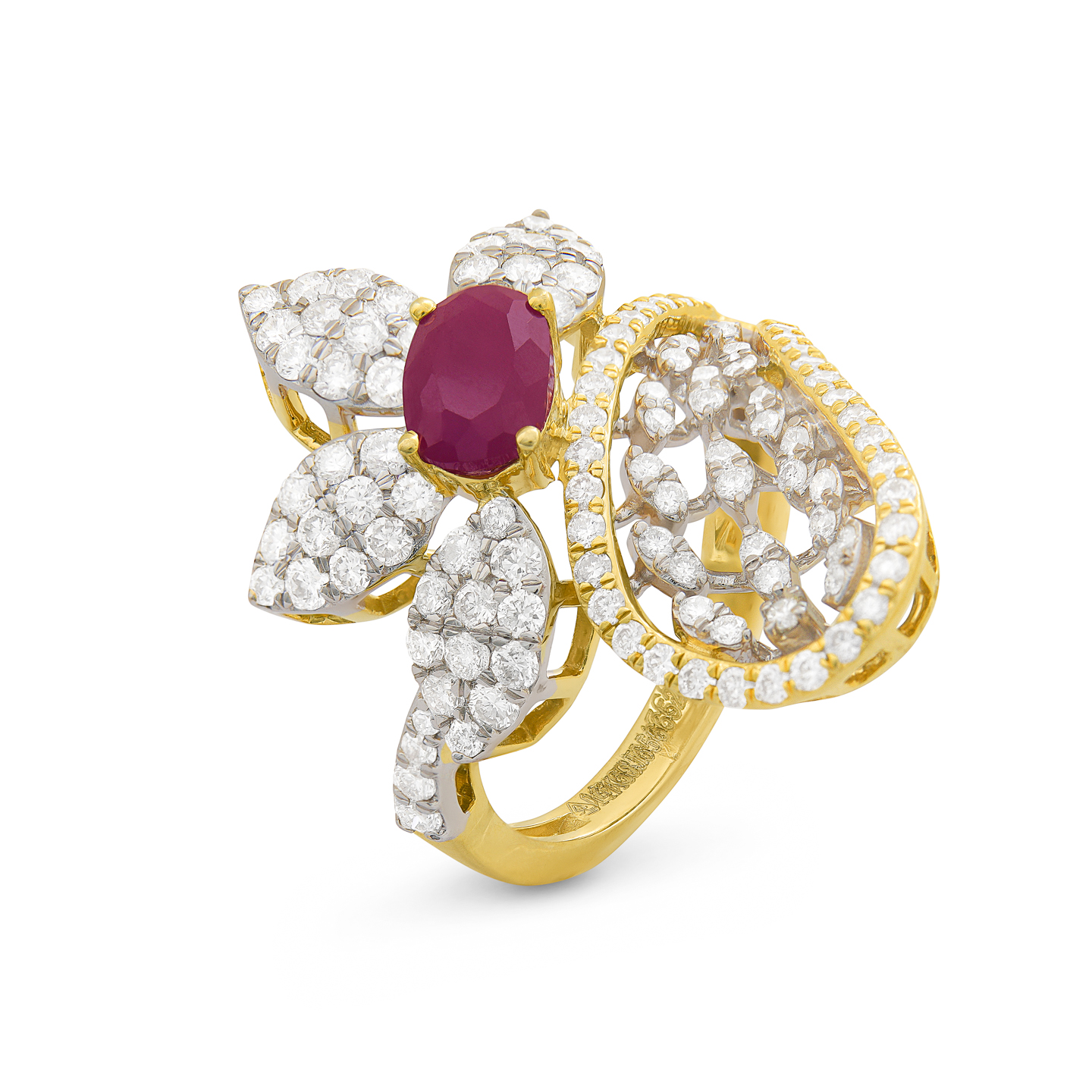 Central Ruby Flower-Drop Micro Diamonds Ring