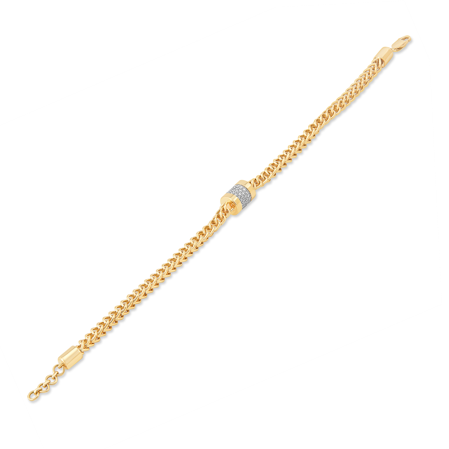 Explore modern elegance with our Chain Style Center Drum-Shaped Diamond Bracelet in 14K Yellow Gold. This unique piece features a captivating diamond setup, creating a chic and sophisticated look for any occasion."