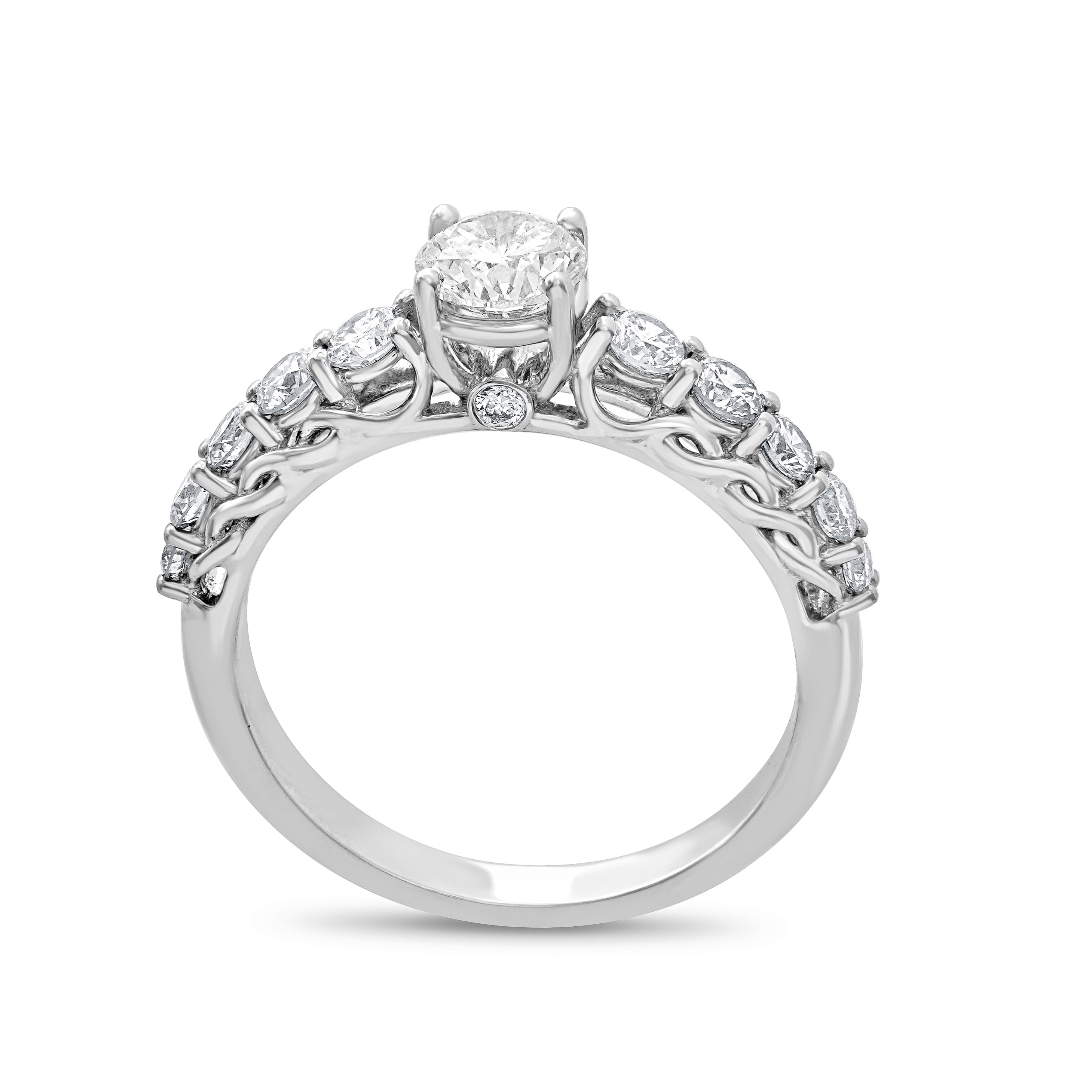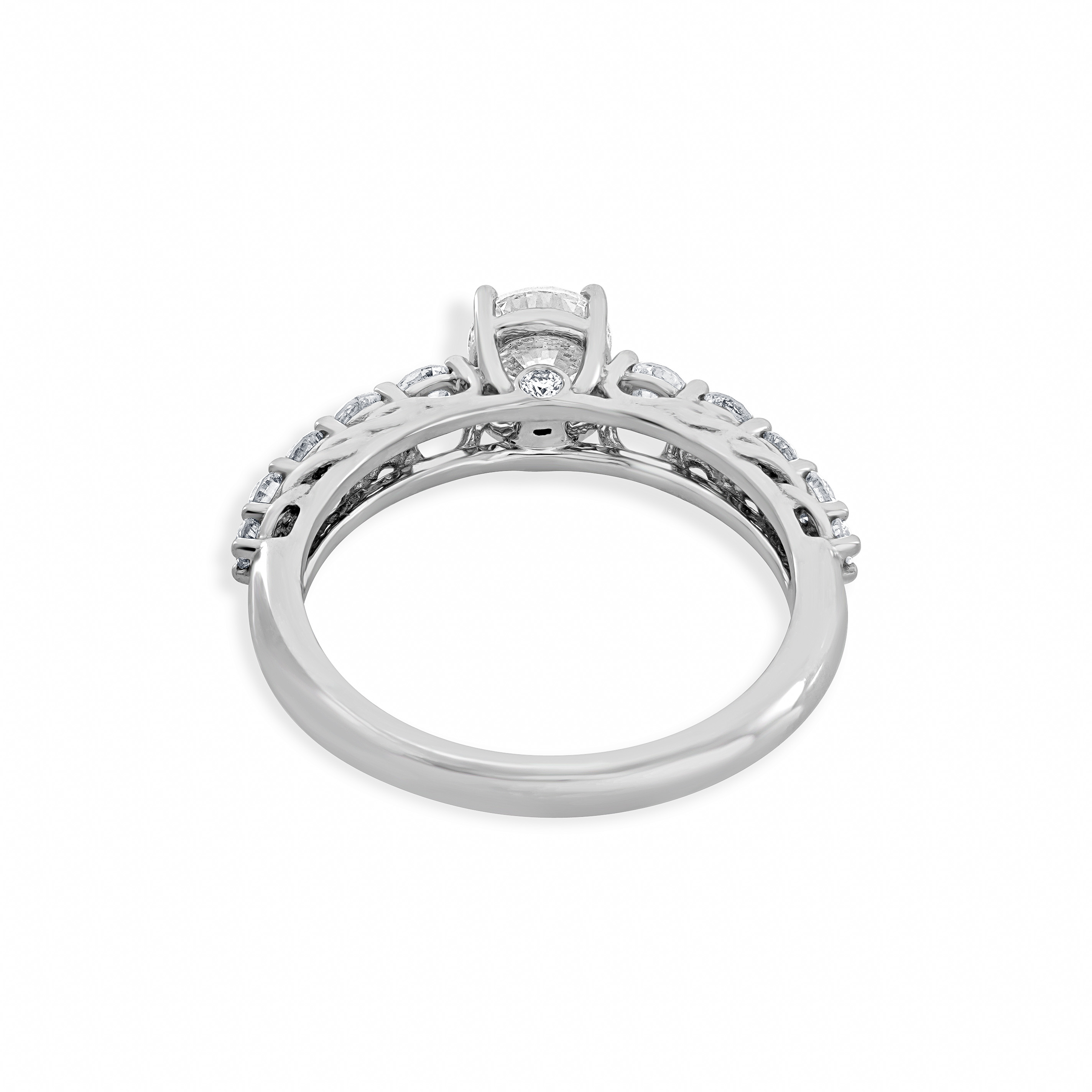 The band of the ring is crafted in lustrous white gold, providing a rich and regal backdrop for the exquisite diamonds.