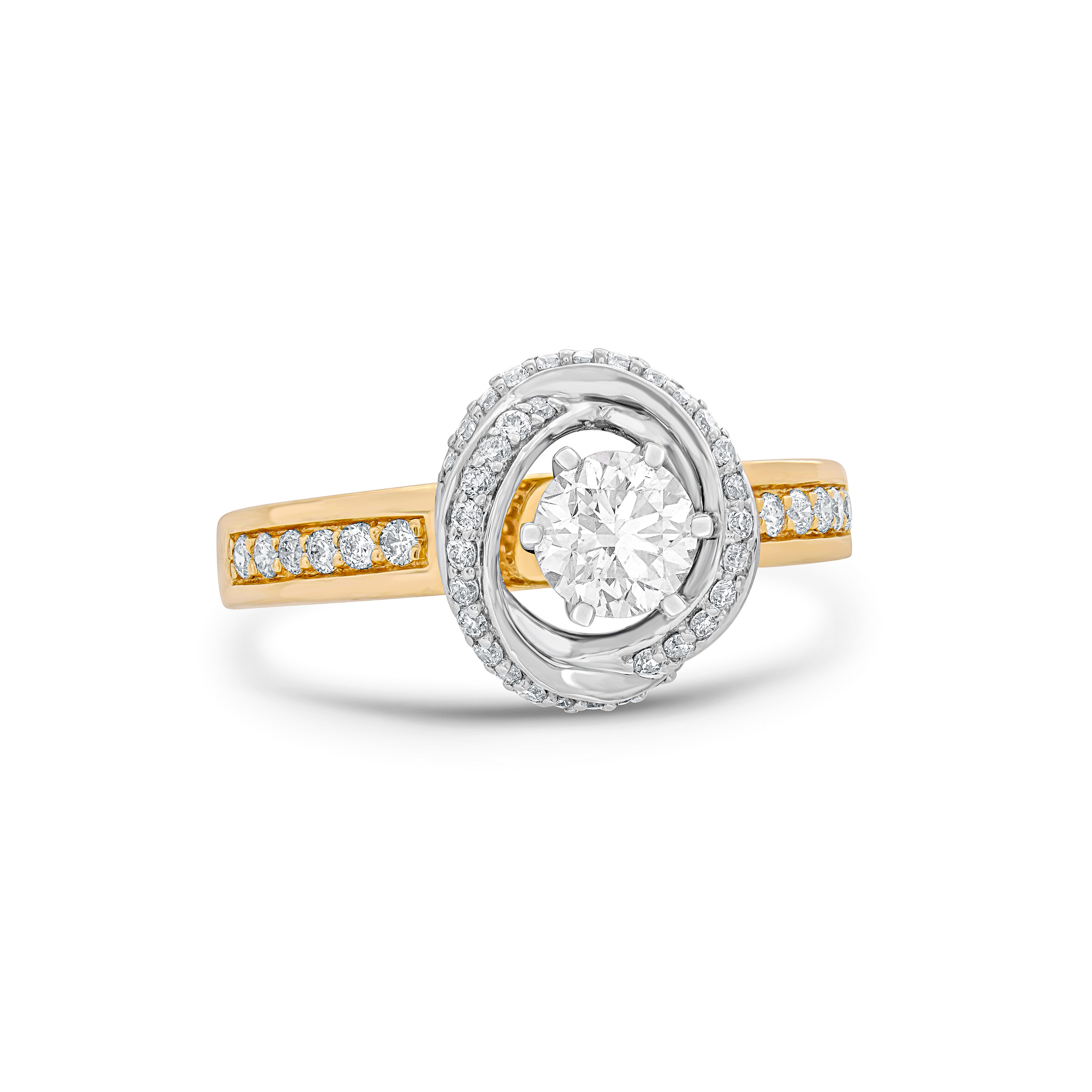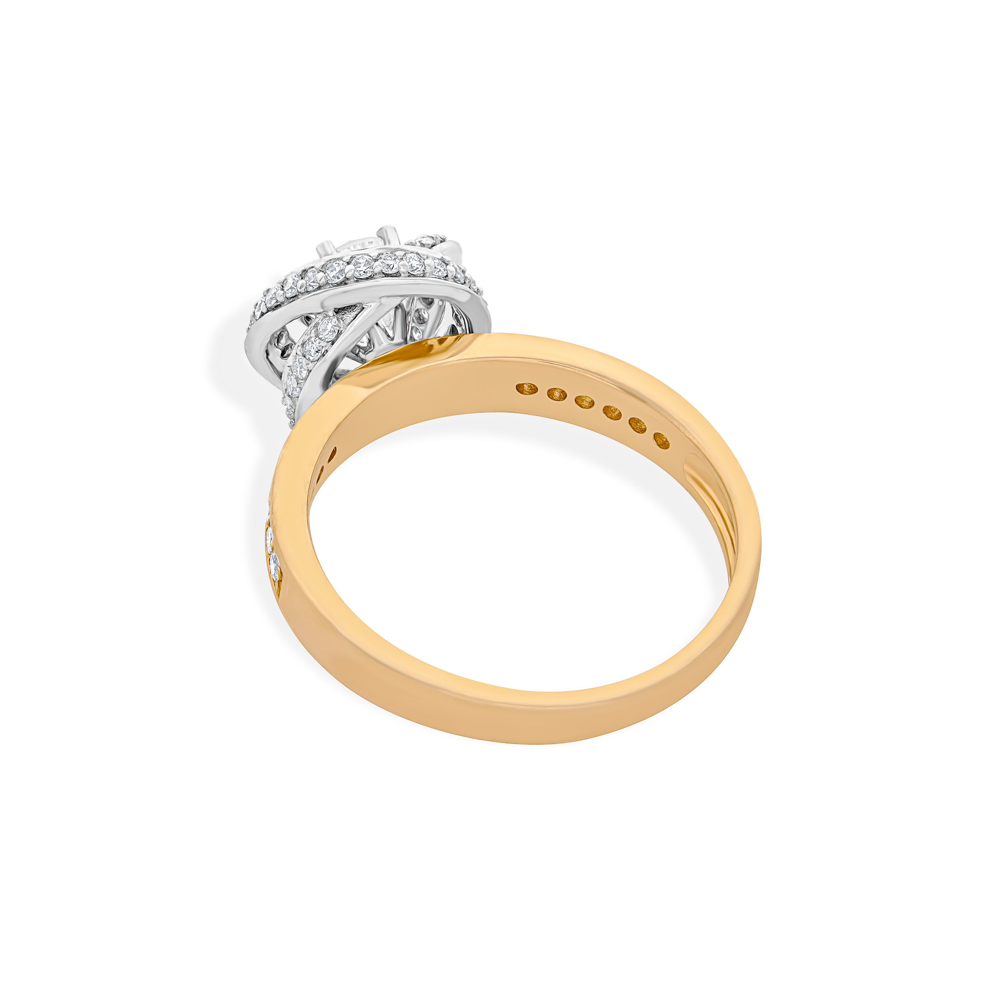 The diamond takes center stage, radiating brilliance and captivating the eye with exceptional cut, clarity and sparkle. Surrounding the diamond are microdiamonds expertly set within the gold setting adds a touch of richness and sophistication to the overall design.