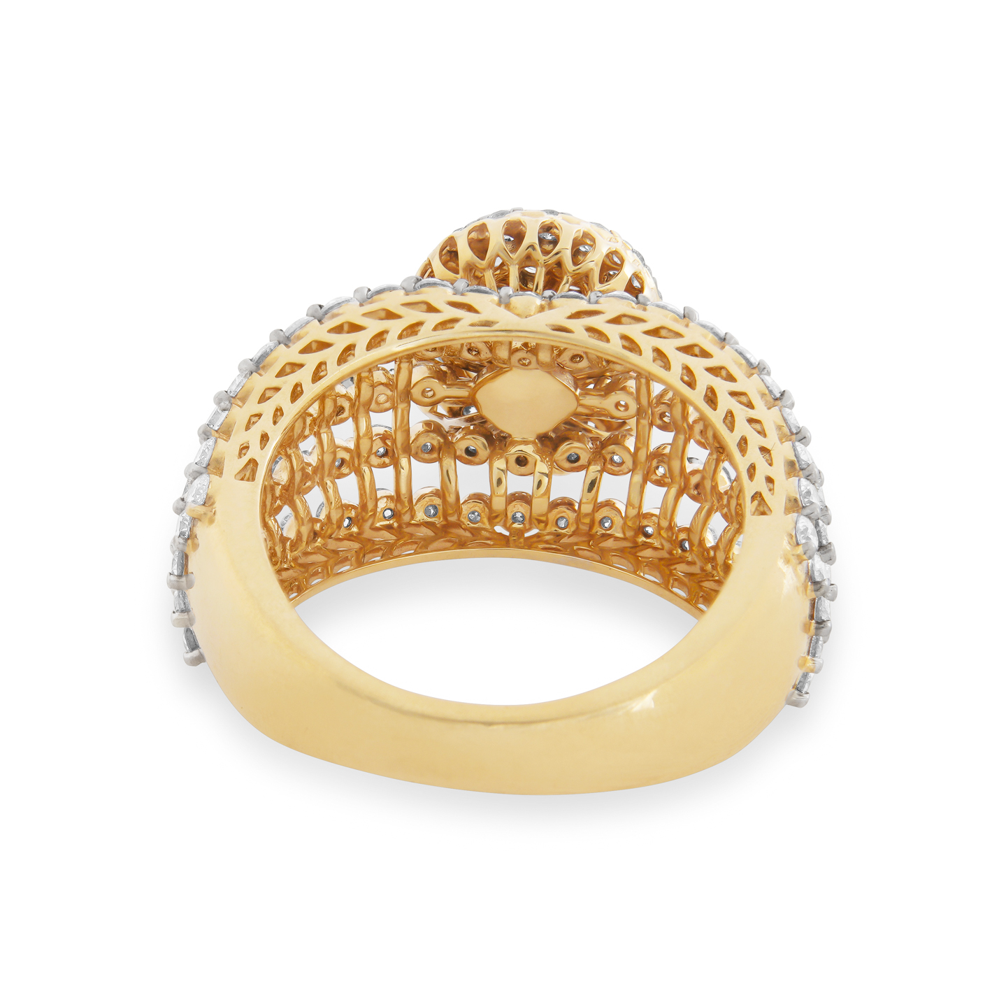 The band of the ring is crafted in gold, providing a lustrous and rich backdrop for the diamonds embedded on it.