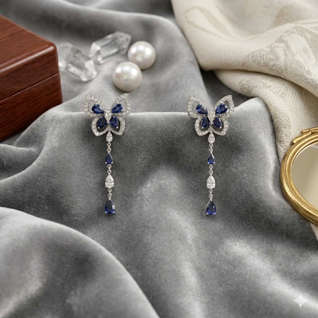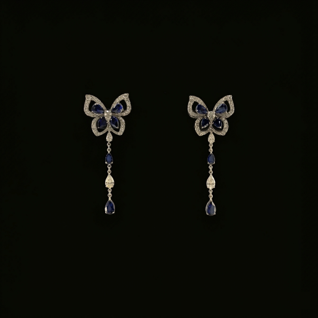 Graceful and feminine, these butterfly-inspired drop earrings feature a delicate outline design adorned with shimmering lab-grown diamonds. The butterfly wings are accented with deep color stones, creating a striking contrast and enhancing the overall elegance.