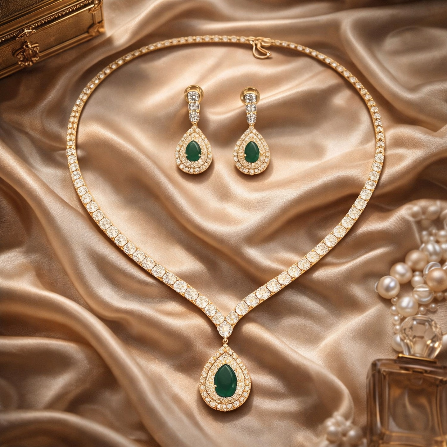 A delicate bridal necklace set crafted with brilliant lab-grown diamonds arranged in elegant floral motifs, highlighted by a pear-shaped colored stone drop pendant. The matching drop earrings mirror the graceful design, creating a refined and timeless statement perfect for wedding celebrations and special occasions.