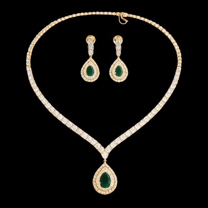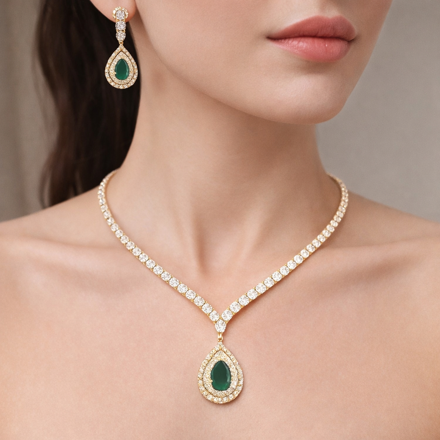 An elegant bridal necklace set crafted with shimmering lab-grown diamonds in a sleek V-shaped silhouette, highlighted by a pear-shaped colored stone drop pendant. The matching pear drop earrings enhance the graceful design, making it perfect for weddings and grand celebrations.