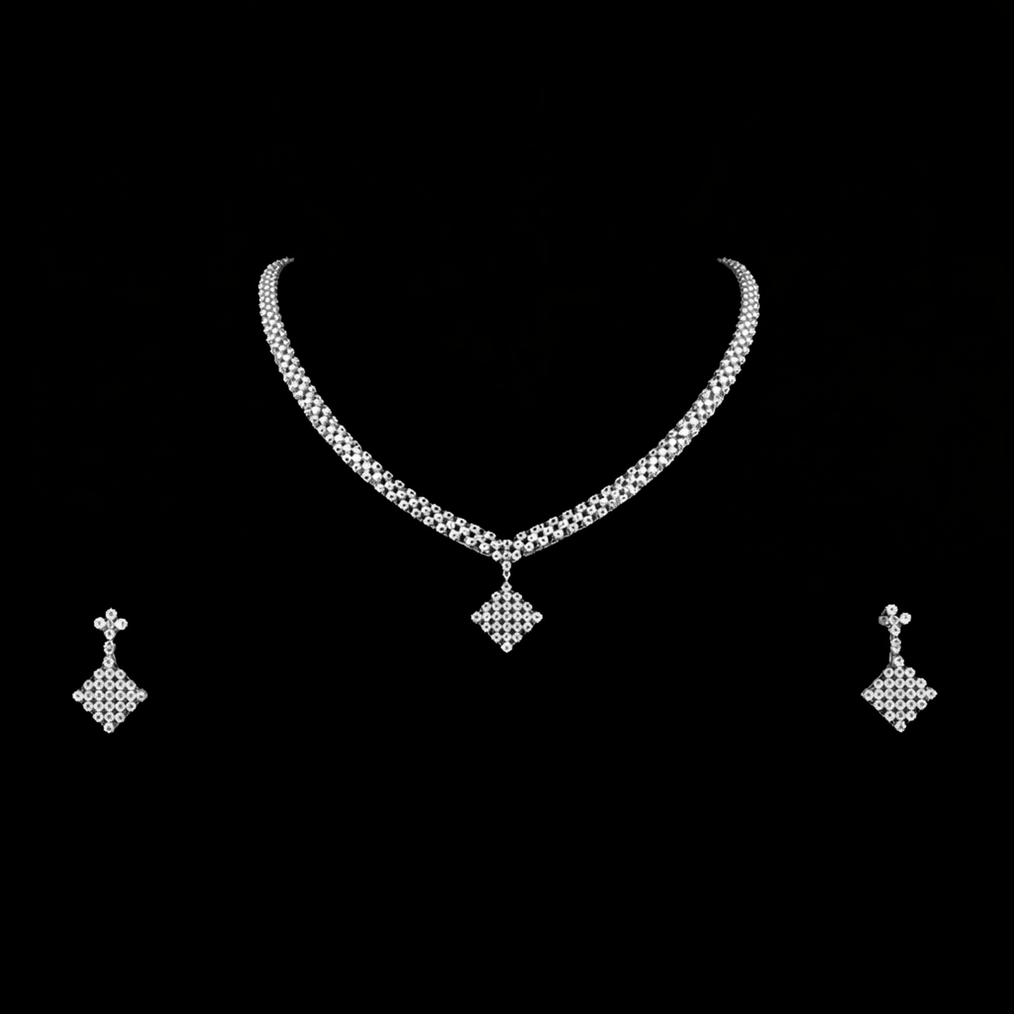 A delicate chain necklace set featuring brilliant lab-grown diamonds arranged in a refined V-line silhouette, finished with a diamond-shape drop pendant. Paired with matching geometric drop earrings, this minimal yet elegant design offers timeless sophistication perfect for evening wear and special occasions.