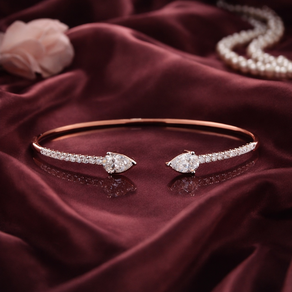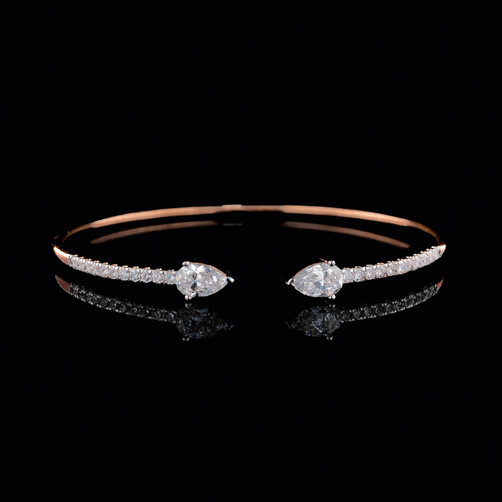 A sleek and contemporary open bracelet featuring two pear-cut lab-grown diamonds facing each other in a balanced, symmetrical design. The elegant teardrop silhouettes create a soft yet striking focal point, enhanced by a delicate line of round pavé-set diamonds along the band.