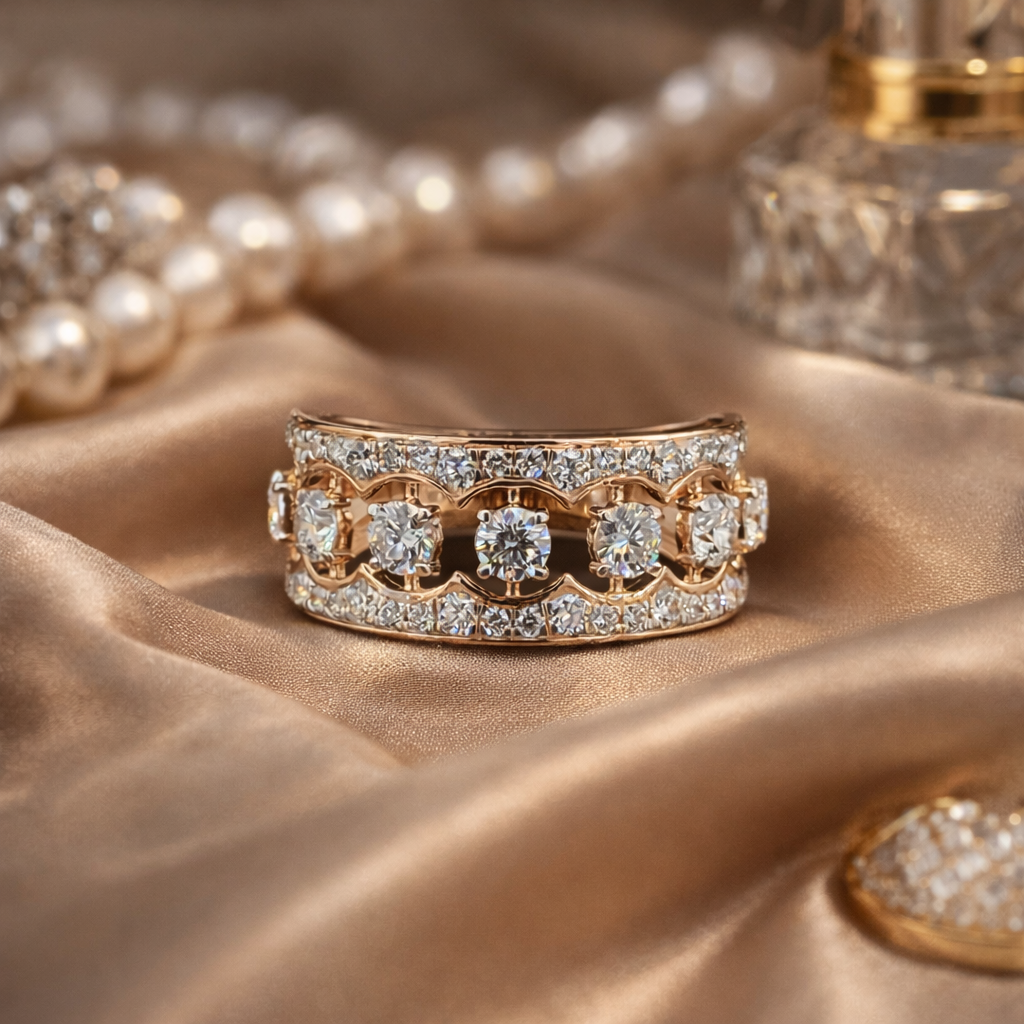 A bold expression of modern luxury, this designer eternity band features a striking dual-row arrangement crafted in elegant rose gold. The center showcases a line of larger round lab-grown diamonds, each beautifully set within open circular frames, creating a distinctive floating effect. Surrounding this centerpiece, two delicate rows of finely set smaller diamonds add layers of brilliance and enhance the overall sparkle.