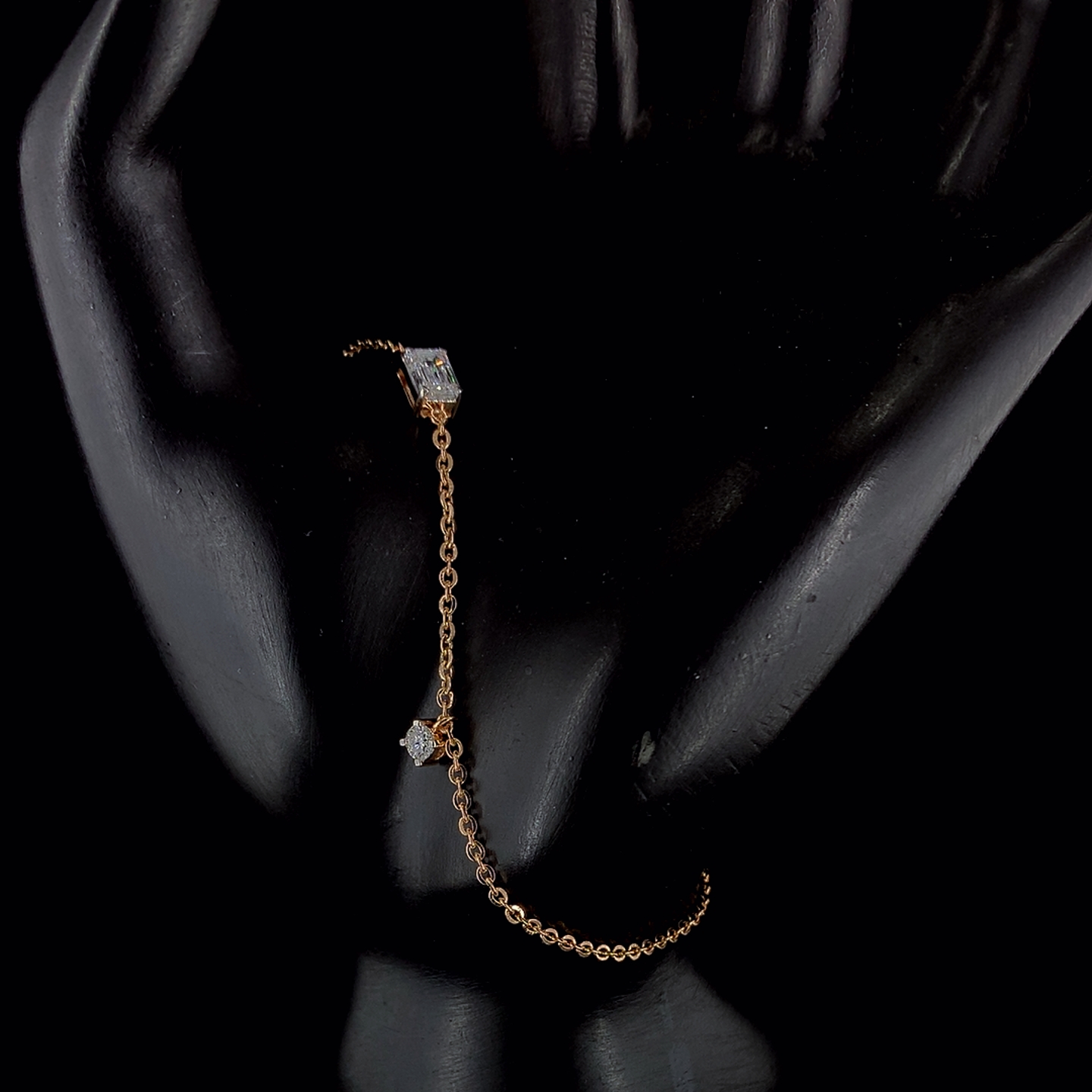 A sleek and modern gold bracelet featuring an emerald-cut lab-grown diamond centerpiece framed in a delicate halo setting. A fine gold chain drop connects to a round solitaire diamond accent, creating a graceful vertical silhouette. Minimal yet striking, this bracelet blends geometric elegance with contemporary charm — perfect for refined everyday styling or elevated occasion wear. ?