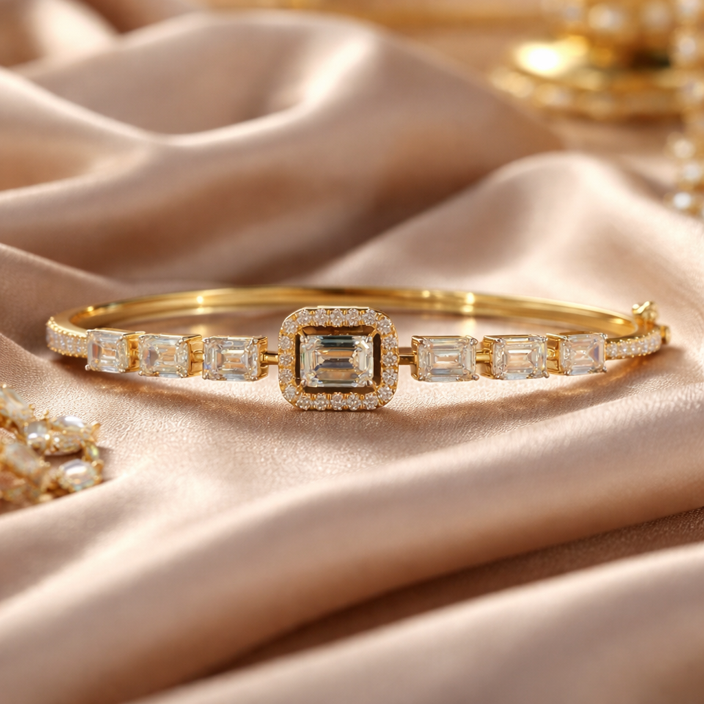 A refined statement bracelet featuring a prominent emerald-cut lab-grown diamond at the center, framed with a delicate round brilliant diamond halo. The band is accented with a sequence of emerald-cut diamonds, creating a sleek, geometric rhythm across the wrist.