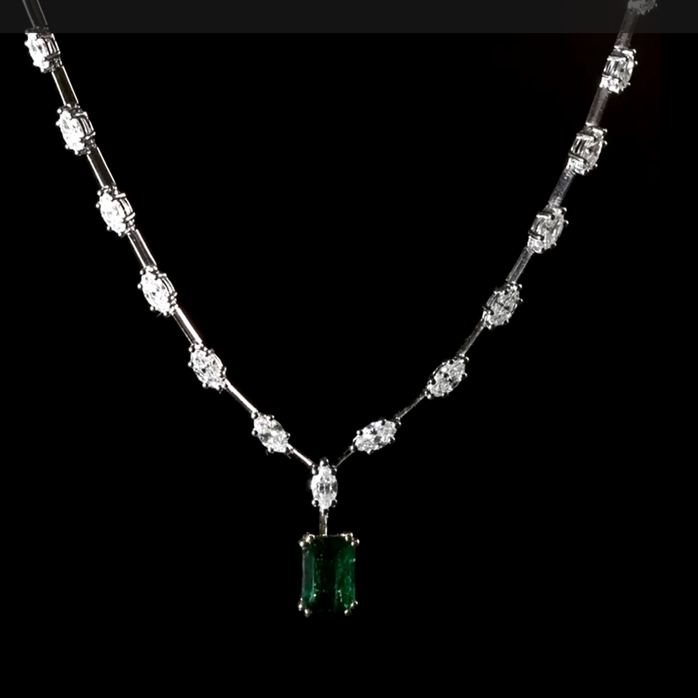 A refined statement necklace showcasing alternating round and emerald-cut lab-grown diamonds along a sleek structured chain. The design is elevated with a bold emerald-cut drop centerpiece, creating a graceful vertical silhouette and striking brilliance. A perfect blend of geometric elegance and contemporary luxury, ideal for bridal and special occasion styling.