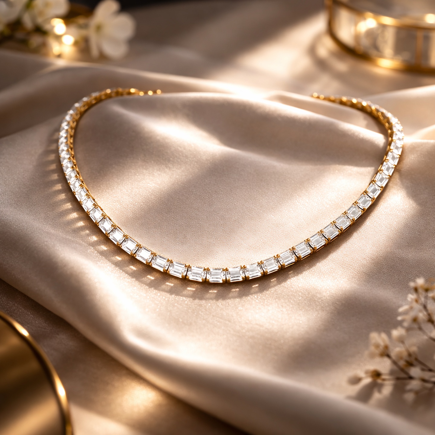 A refined tennis necklace featuring a seamless line of emerald cut lab-grown diamonds, known for their clean step facets and sophisticated hall-of-mirrors brilliance. The structured, elongated silhouette delivers understated luxury and timeless elegance—ideal for elevated everyday wear or formal occasions.