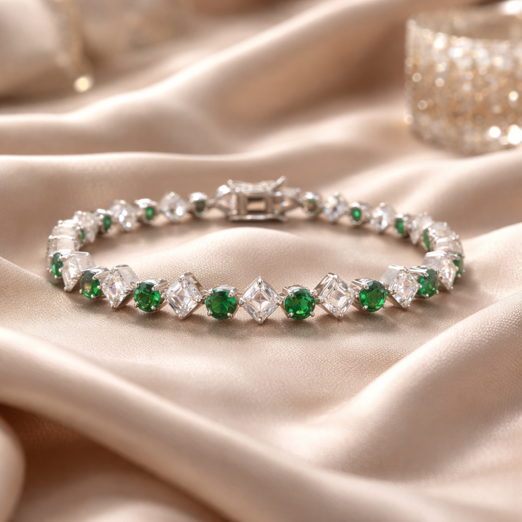 A striking geometric bracelet featuring alternating princess-cut lab-grown diamonds set at an angle and vivid round emerald accents. The dynamic zig-zag alignment creates a contemporary silhouette, blending structured brilliance with rich green contrast. Elegant yet bold, this design is perfect for bridal styling, festive occasions, or statement luxury layering.