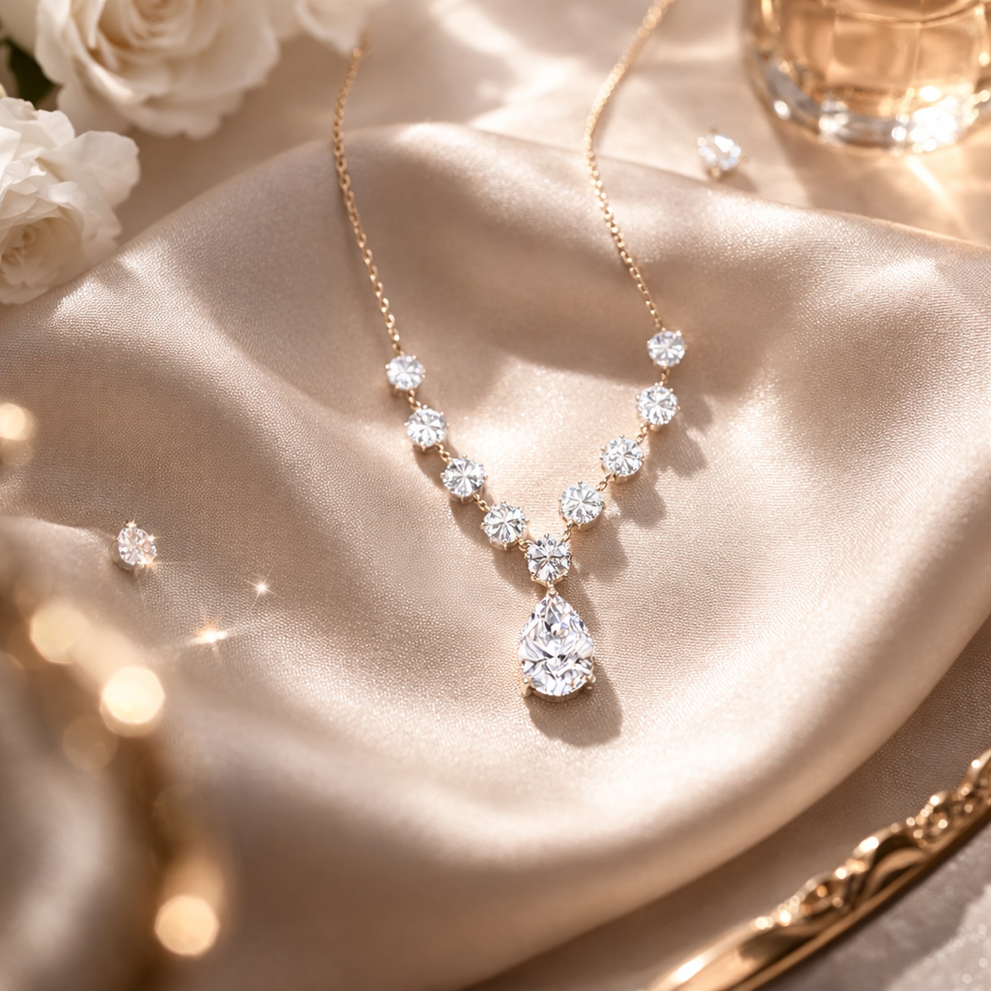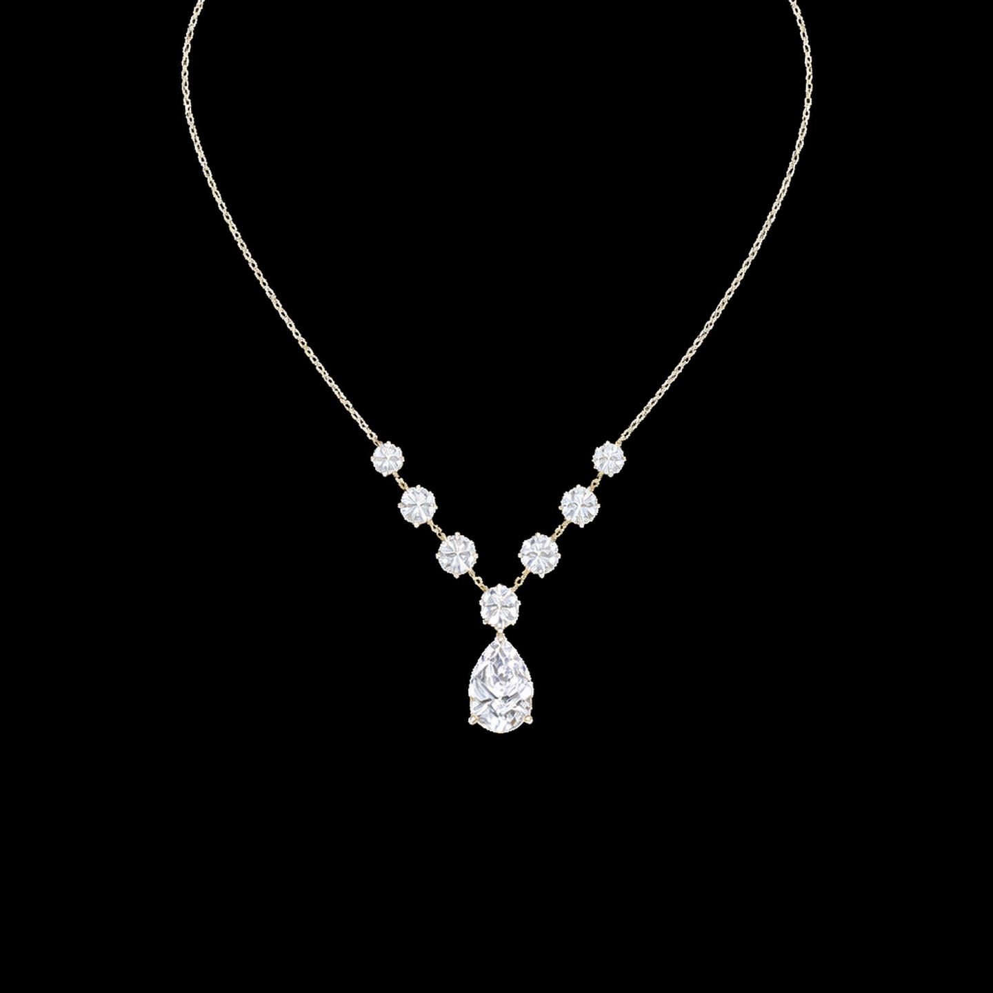 A refined chain necklace featuring brilliant lab-grown diamond floral motifs arranged in a graceful V pattern, leading to a striking pear-shaped diamond drop centerpiece. The elegant silhouette enhances the neckline with timeless sparkle and sophisticated charm, making it perfect for occasions and elevated styling.