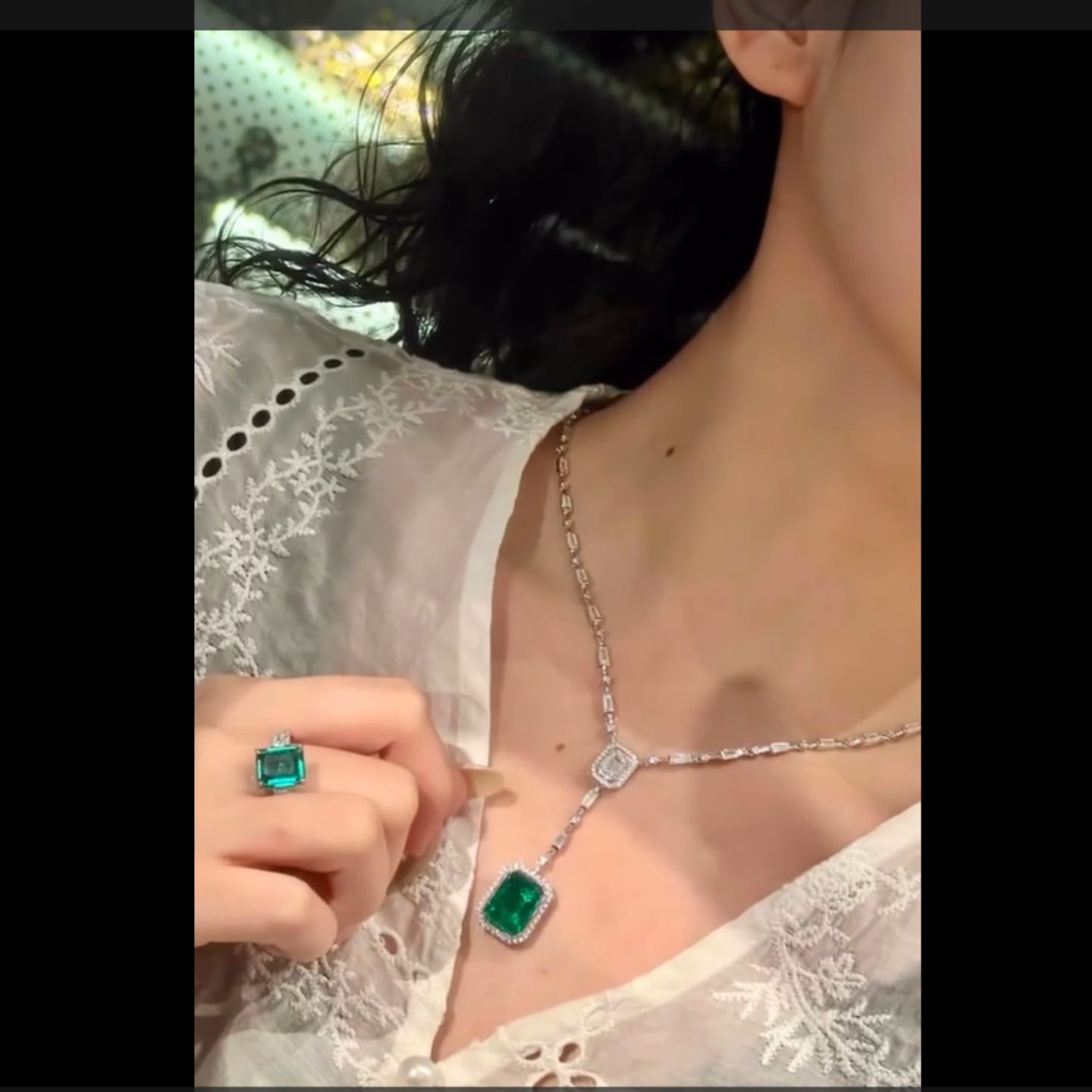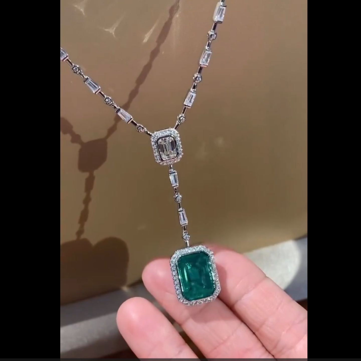 A contemporary Y-drop necklace showcasing emerald-cut lab-grown diamonds framed in refined halo settings. The structured chain is accented with alternating baguette and round diamonds, enhancing the geometric rhythm of the design. The elongated drop silhouette creates a graceful, statement finish—perfect for bridal elegance and elevated evening styling.