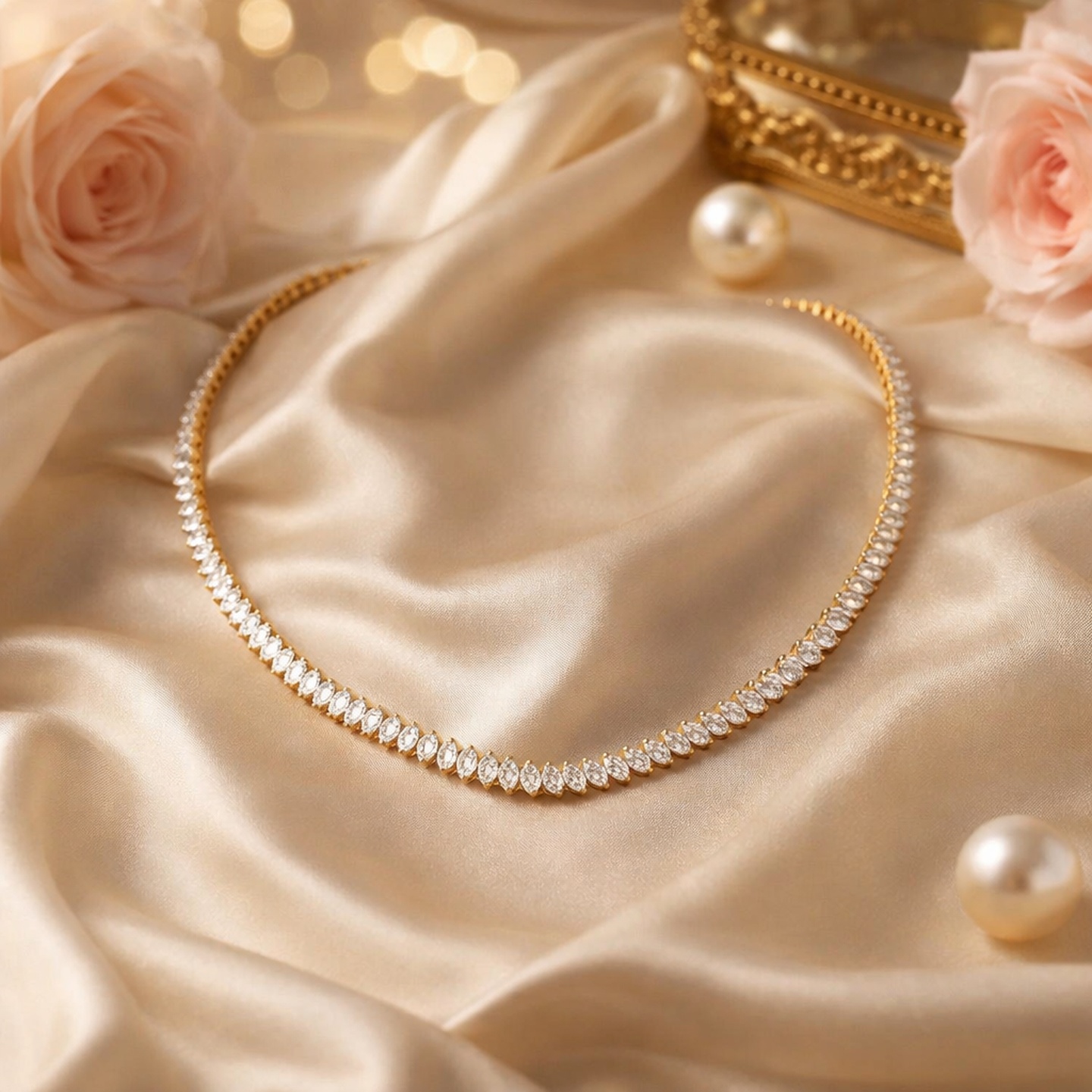 A graceful tennis necklace featuring a continuous row of marquise cut lab-grown diamonds, creating a delicate leaf-like silhouette along the neckline. The elongated shape enhances brilliance while offering a soft, elegant flow—perfect for refined celebrations and timeless luxury styling.