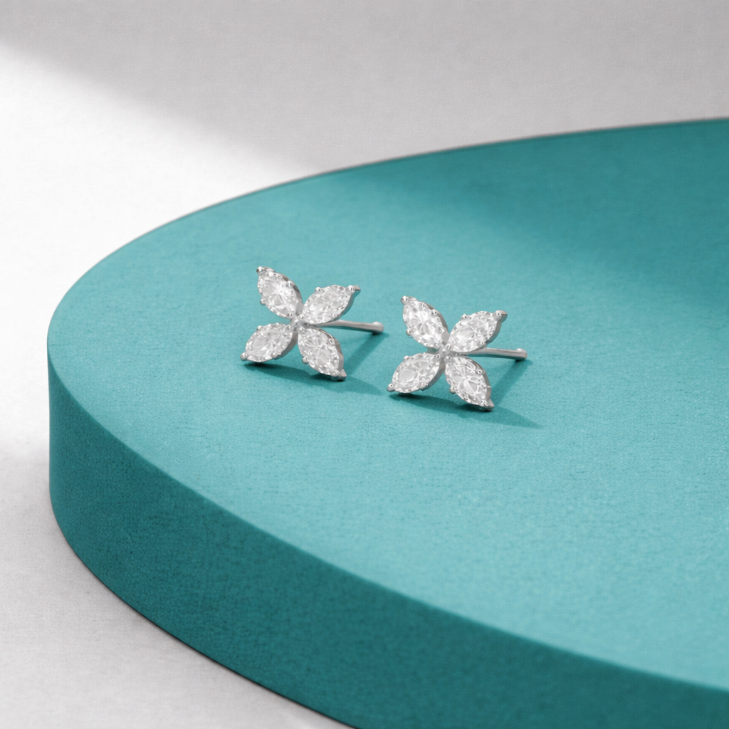 Delicate and elegant, these floral stud earrings feature a graceful arrangement of marquise-cut lab-grown diamonds, forming a refined flower-inspired design. Each petal-shaped diamond is carefully set to create a symmetrical and sparkling silhouette.
