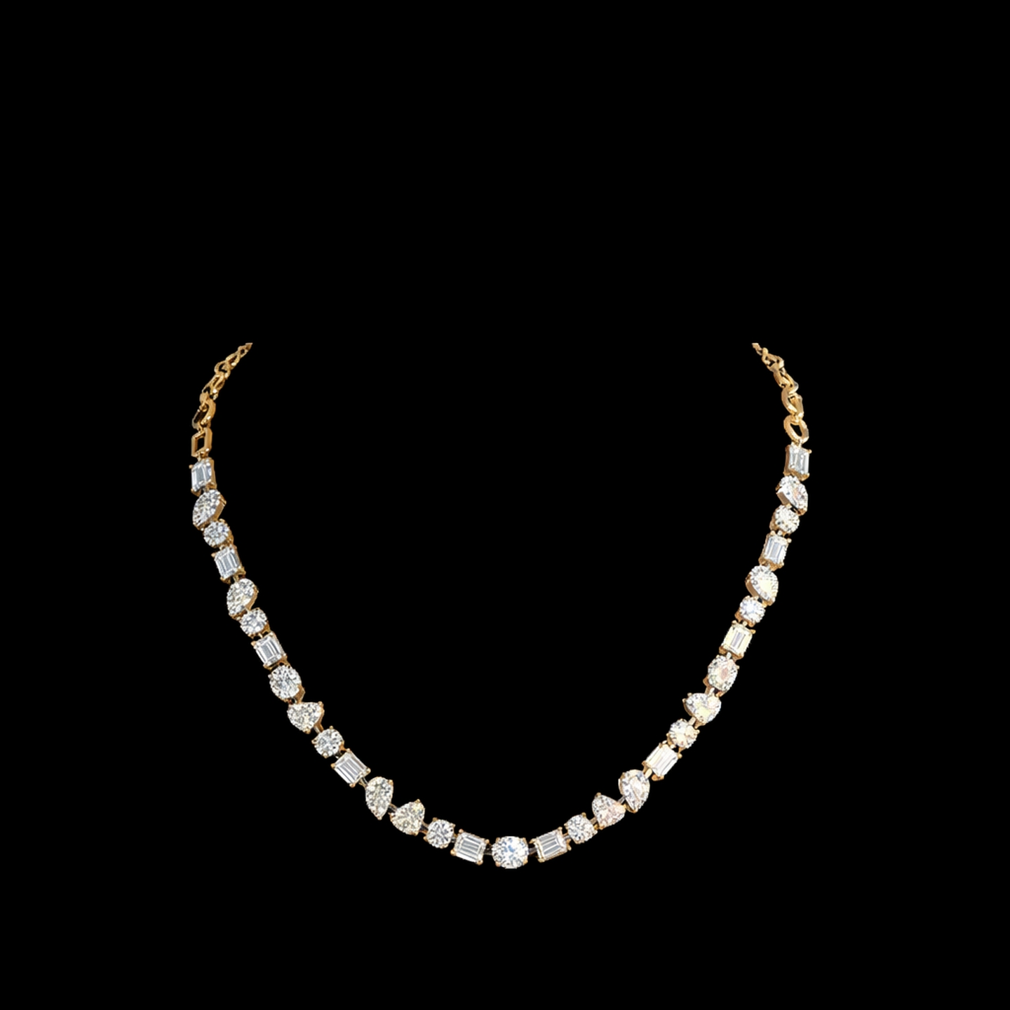A striking tennis necklace featuring an elegant combination of round, pear, and emerald cut lab-grown diamonds arranged in a seamless alternating pattern. The mix of soft curves and clean geometric lines creates dynamic brilliance and modern sophistication, making it a versatile statement for both occasions and elevated everyday styling.