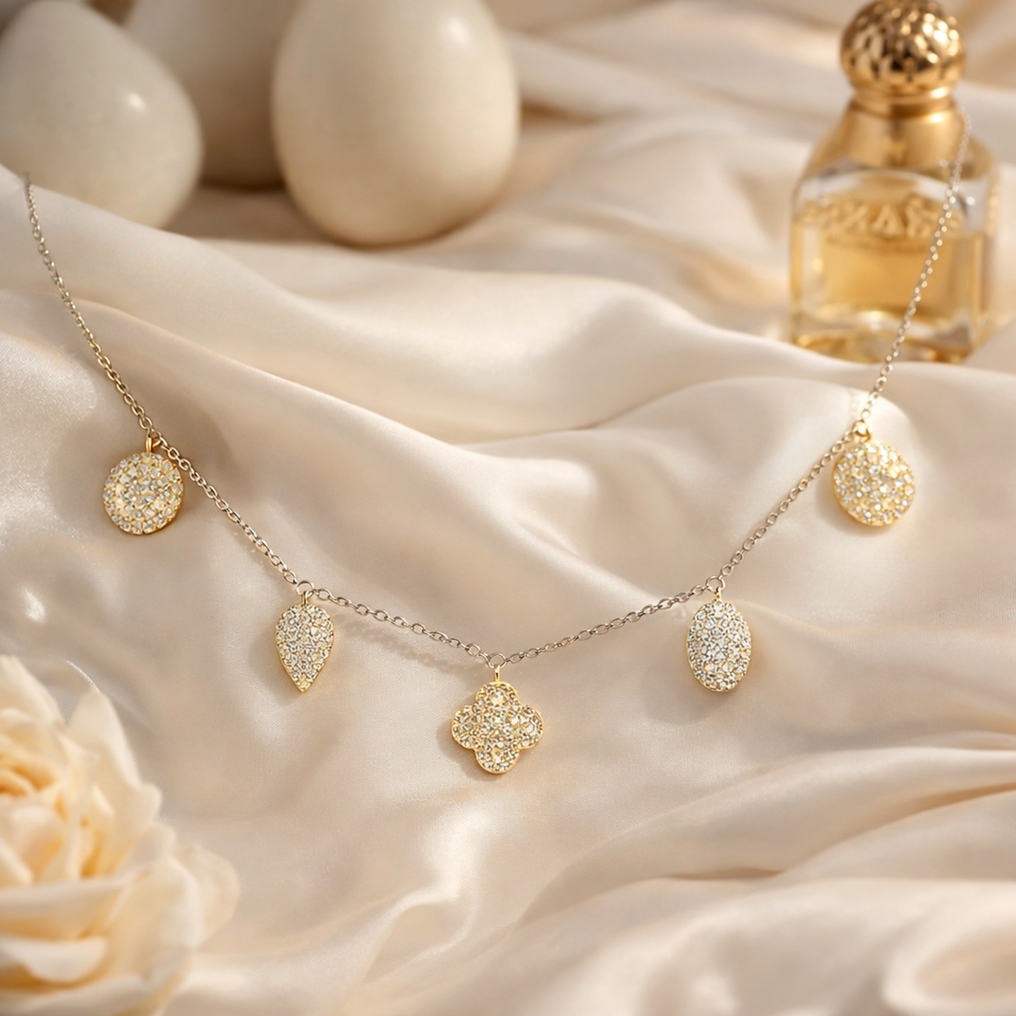 Elegant lab-grown diamond necklace featuring round, pear, oval, and floral-shaped diamond charms in a delicate drop design. A chic and versatile piece perfect for everyday elegance, gifting, and modern festive styling.
