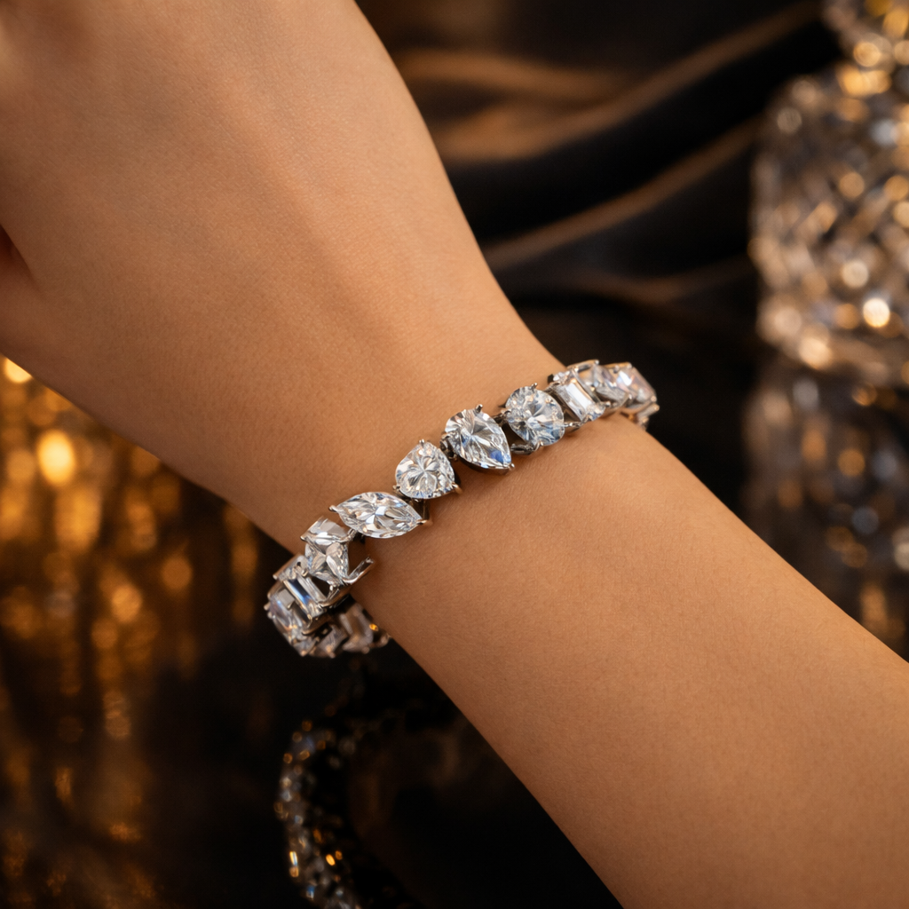 A bold celebration of brilliance, this tennis bracelet showcases a striking arrangement of mixed-shape lab-grown diamonds, including round, pear, marquise, emerald, and princess cuts. The alternating silhouettes create a dynamic, high-luxury rhythm that elevates the classic tennis style into a true statement design.