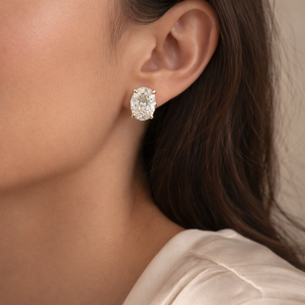 These timeless stud earrings feature brilliant oval-cut lab-grown diamonds set in a classic four-prong solitaire design. The elongated oval silhouette enhances sparkle while offering a graceful and elegant appearance.