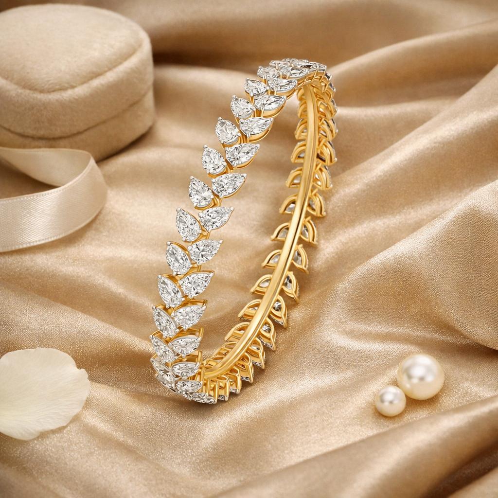 A graceful designer bangle crafted in a radiant yellow gold finish, featuring a continuous arrangement of pear-cut lab-grown diamonds that create a flowing, leaf-inspired pattern around the band. Each pear-shaped diamond is carefully set to highlight its brilliance while forming an elegant rhythmic design that enhances the bangle’s refined silhouette. The intricate side detailing and luminous diamonds give this piece a luxurious and contemporary charm, making it a perfect statement accessory for both special occasions and elevated everyday wear.