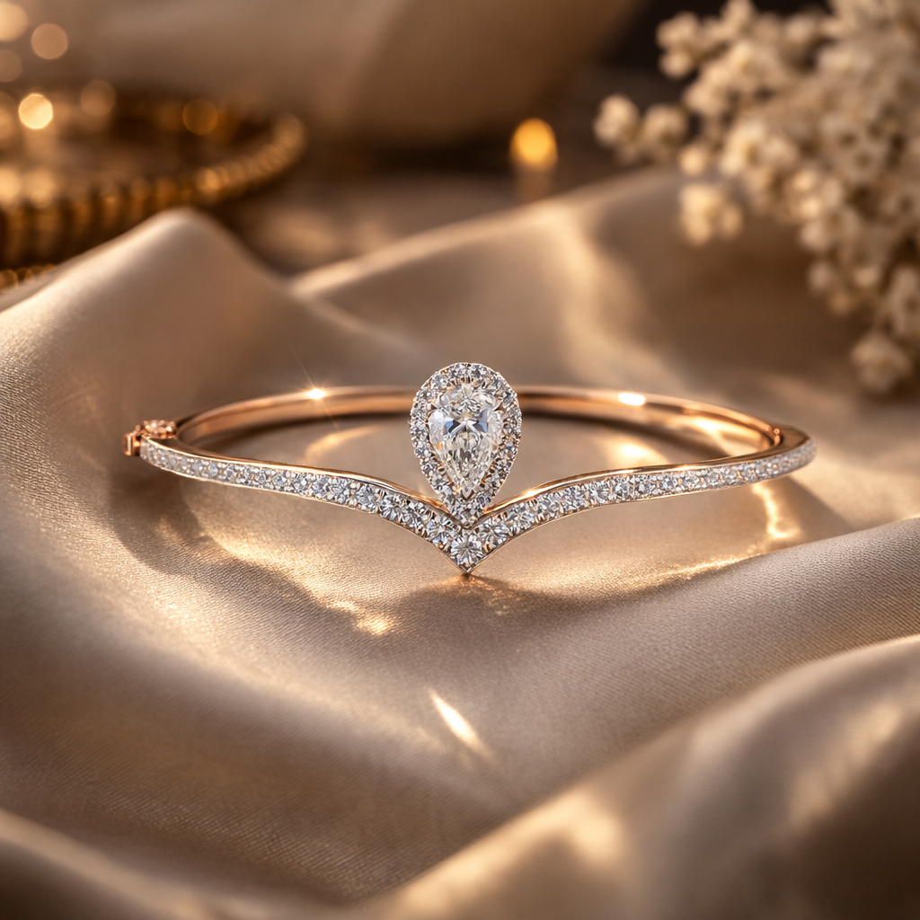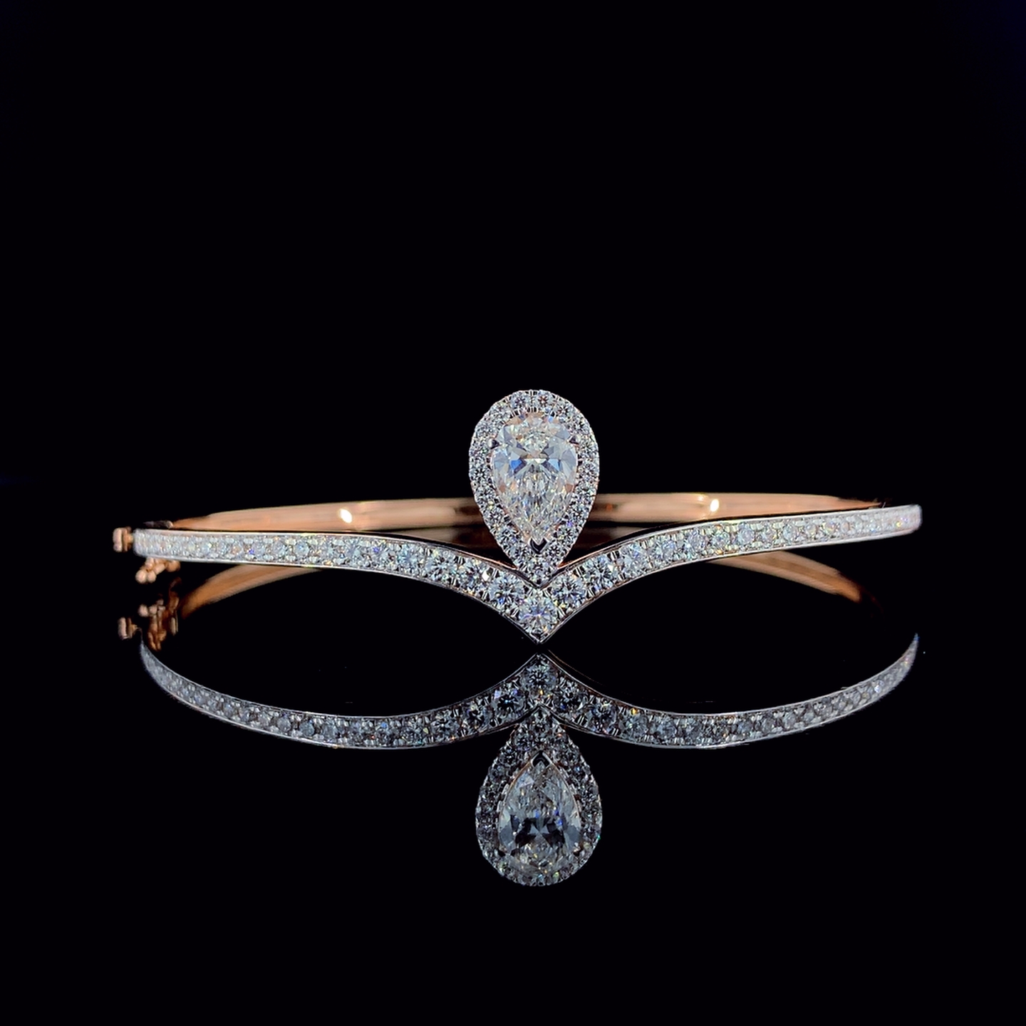 An elegant open V-shape bracelet showcasing a captivating pear-cut lab-grown diamond at the center, surrounded by a shimmering halo of round brilliant diamonds. The delicately curved band is lined with fine pavé-set diamonds, enhancing the graceful silhouette with continuous sparkle. Crafted in a warm rose-gold tone, this refined design offers a perfect balance of modern sophistication and timeless brilliance, ideal for statement styling and special occasions.