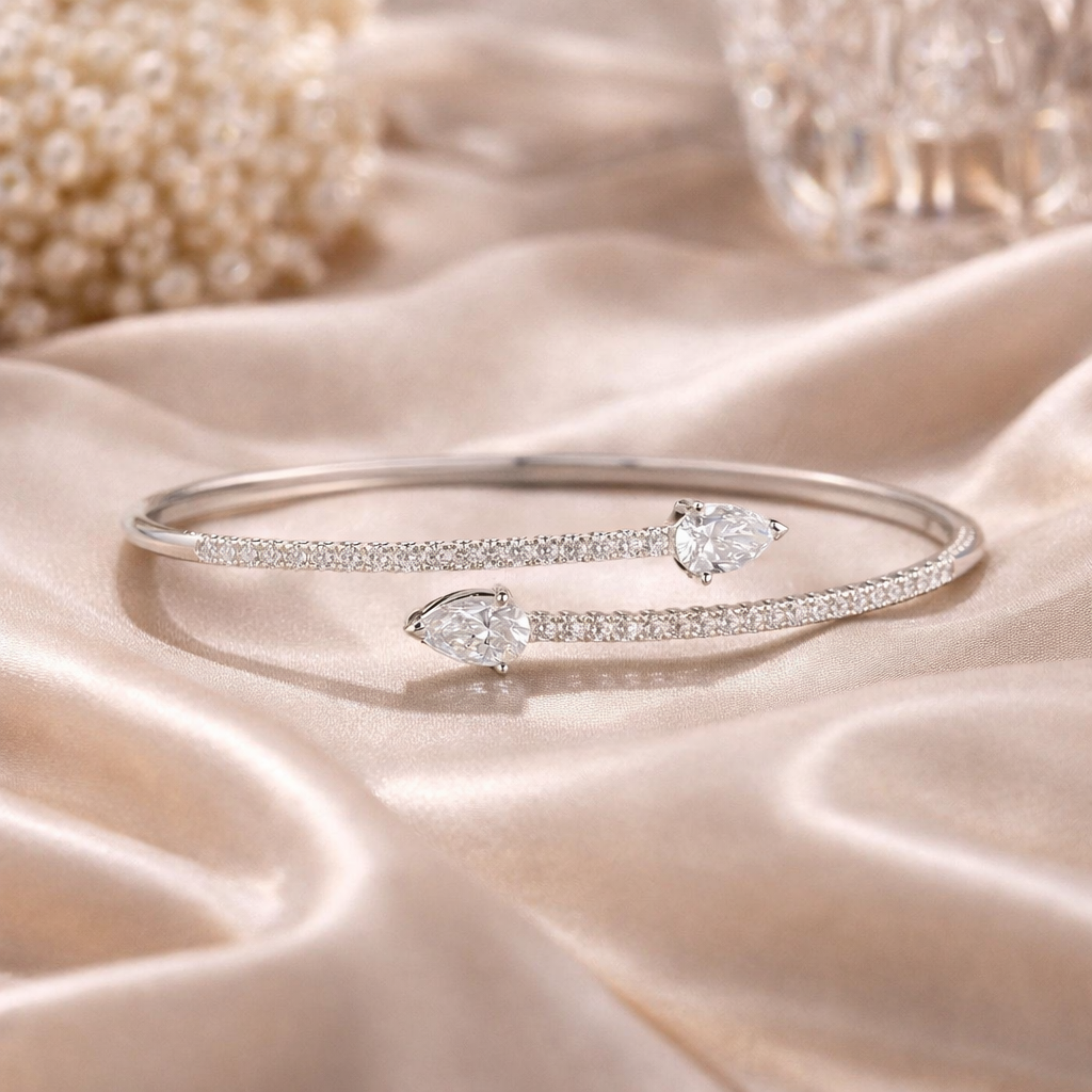A delicate open cuff bracelet featuring two pear-cut lab-grown diamonds gracefully set at each end. The slender band is adorned with fine pavé-set round brilliant diamonds, enhancing the elegant curve with continuous sparkle.