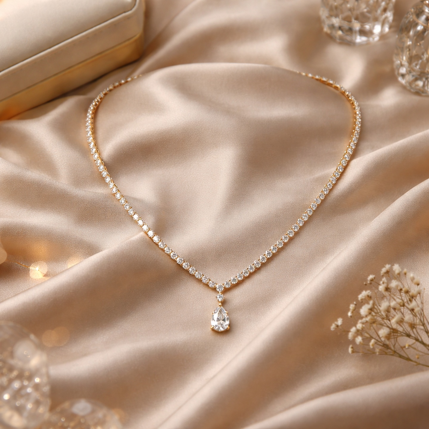 A timeless tennis necklace crafted with a seamless line of brilliant round lab-grown diamonds, gracefully finished with a pear cut drop pendant at the center. The elegant V silhouette enhances the neckline, while the pear-shaped diamond adds refined brilliance and soft movement—perfect for sophisticated evening styling and modern luxury wear.