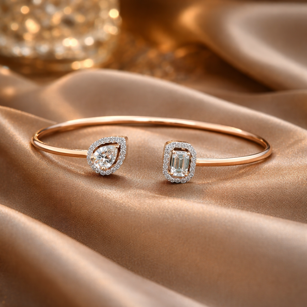 A refined expression of modern elegance, this open cuff bracelet features two distinctive lab-grown diamond centers — a pear-cut diamond and an emerald-cut diamond — each framed with a delicate halo of round brilliant diamonds. The contrasting shapes create a sophisticated asymmetrical silhouette with balanced brilliance and clean geometry.