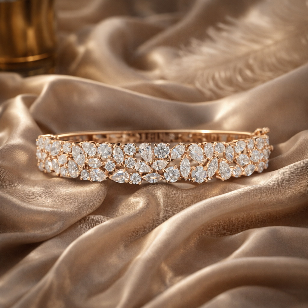 A luxurious statement bracelet featuring an intricate arrangement of pear-cut and round brilliant-cut lab-grown diamonds, artfully clustered to create a floral-inspired, dimensional surface that radiates brilliance from every angle. Crafted in a warm rose-gold tone, the wide silhouette delivers bold sparkle with refined elegance, making it a striking choice for grand occasions and elevated luxury styling.