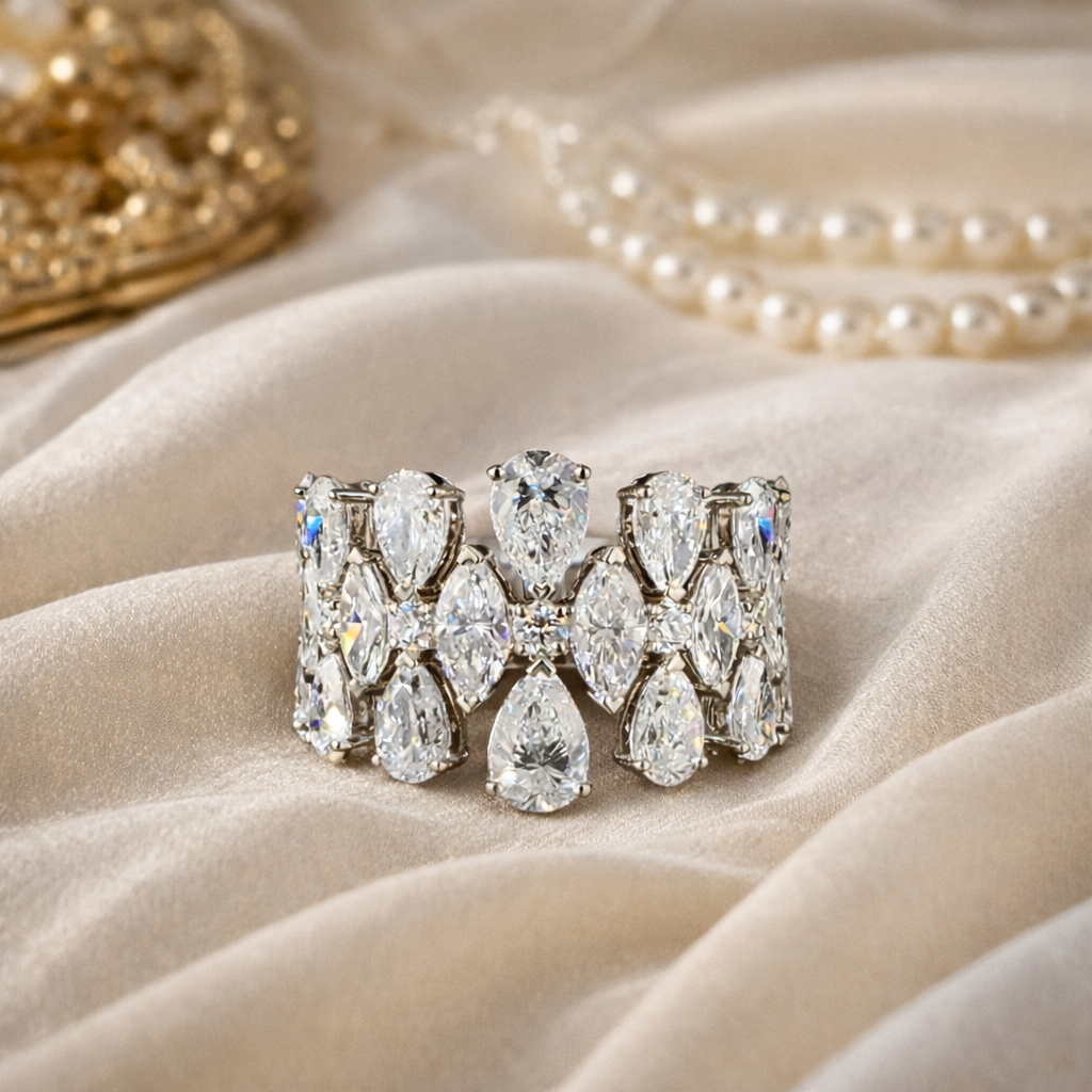 A bold and luxurious statement piece, this eternity band is adorned with beautifully arranged pear-shaped lab-grown diamonds, creating a striking crown-like silhouette. Each diamond is meticulously set to form a continuous pattern of brilliance, with alternating orientations that enhance depth, sparkle, and visual movement.