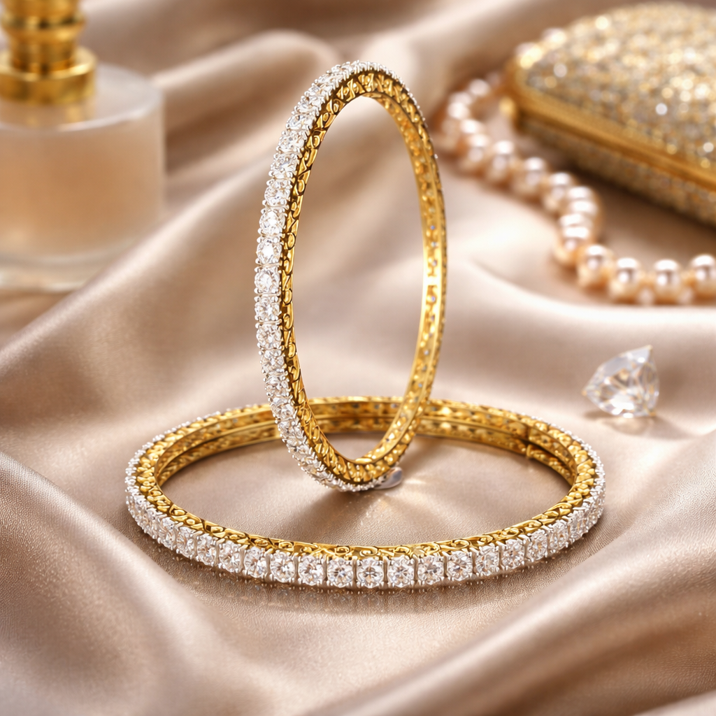 A timeless pair of bangles crafted in radiant yellow gold, featuring a continuous row of sparkling round brilliant-cut lab-grown diamonds set along the outer edge for exceptional brilliance. The sleek and slender profile enhances the beauty of each diamond while the detailed inner gold structure adds refined craftsmanship and strength to the design. Elegant, versatile, and sophisticated, this diamond bangle pair offers a perfect balance of classic luxury and modern style, making it ideal for festive occasions, bridal wear, or everyday elegance.