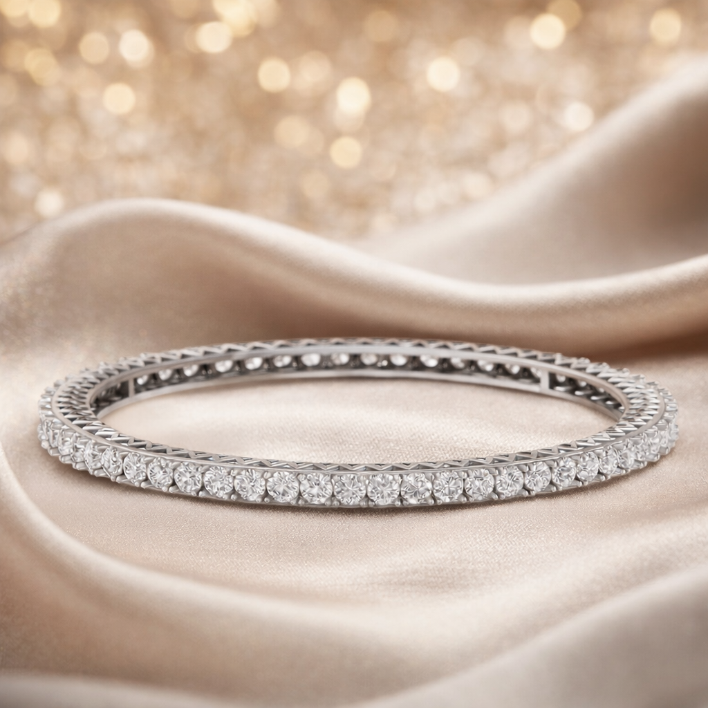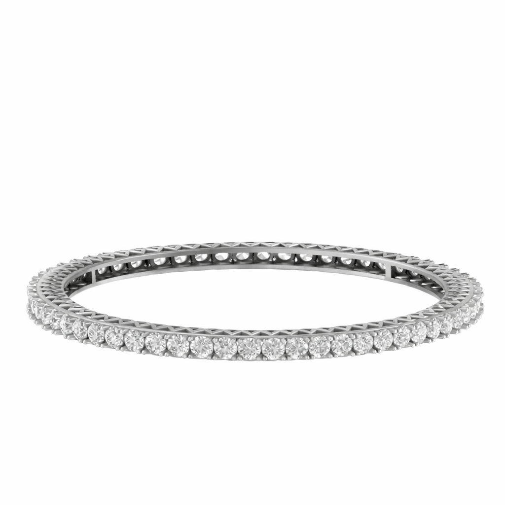 A sleek and timeless bangle featuring a continuous row of shimmering round brilliant-cut lab-grown diamonds set in a refined white gold finish. The precisely aligned diamonds create a delicate eternity-style band that radiates brilliance and elegance from every angle. Intricate geometric openwork detailing along the inner frame adds depth and craftsmanship while enhancing the flow of light through the diamonds. This sophisticated bangle embodies classic luxury and understated elegance, making it perfect for both everyday refinement and special occasions.