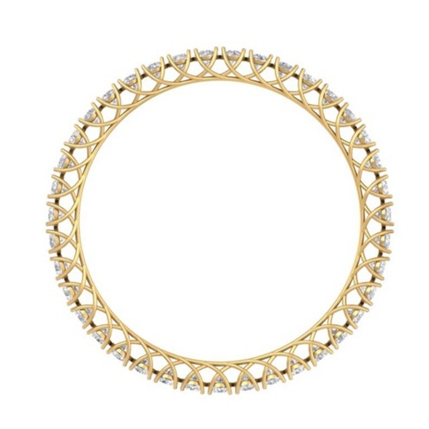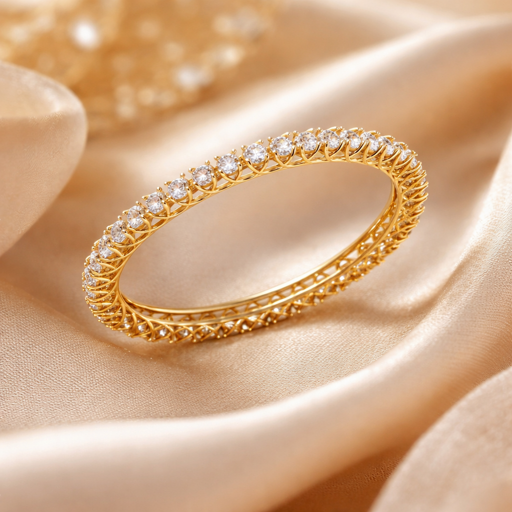 An elegant designer bangle crafted in a polished yellow gold finish, featuring a graceful row of round brilliant-cut lab-grown diamonds set along the top for radiant sparkle. The piece is beautifully enhanced with intricate lattice-style metalwork along the sides, creating a delicate open framework that adds depth and sophistication to the design. With its refined craftsmanship and timeless brilliance, this bangle offers a luxurious blend of artistry and elegance, perfect for elevating both everyday and occasion wear.