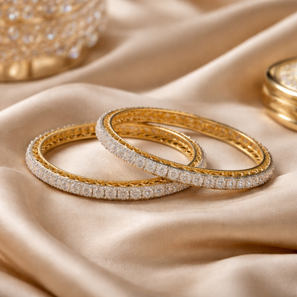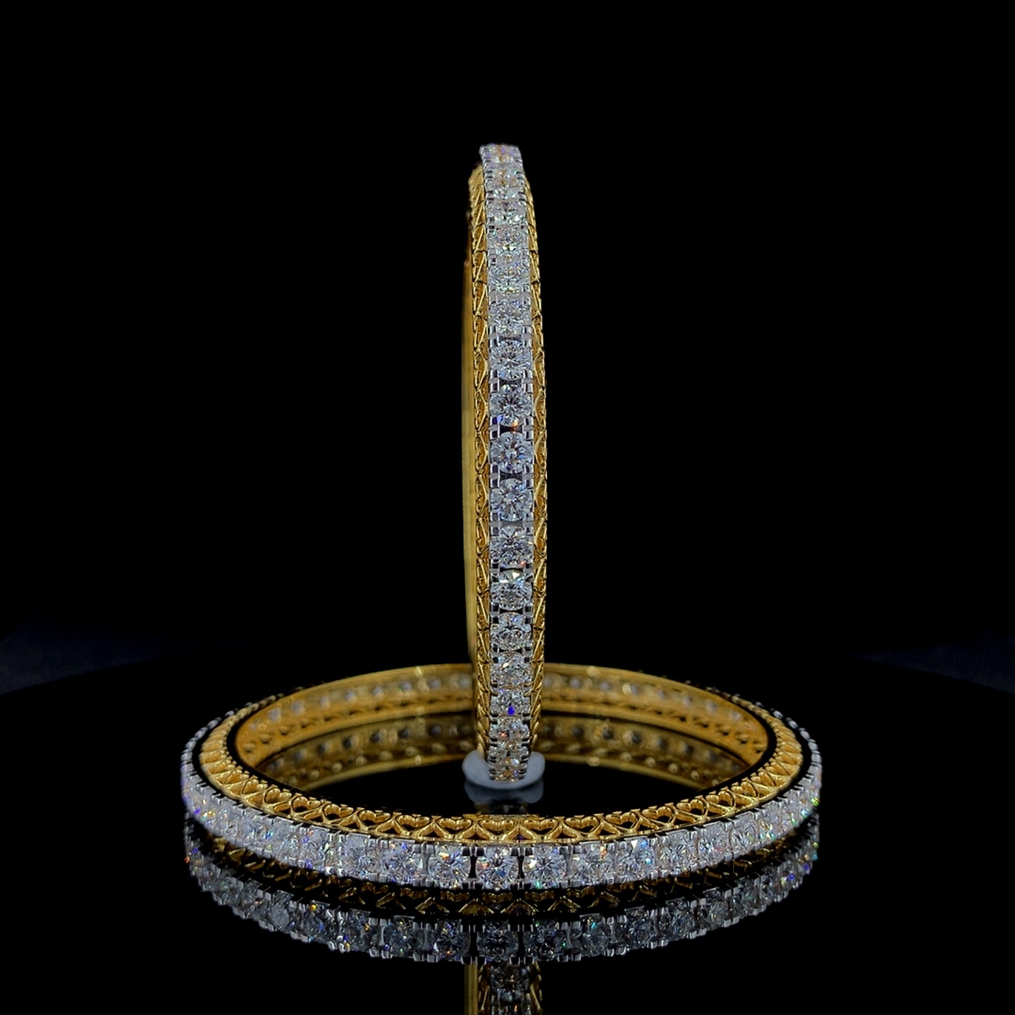 A graceful pair of bangles crafted in radiant yellow gold, featuring a continuous row of sparkling round brilliant-cut lab-grown diamonds that create a brilliant and elegant edge. The inner band is beautifully detailed with delicate heart-shaped patterns, adding a romantic and artistic touch to the design. The combination of dazzling diamonds and intricate gold craftsmanship gives this designer bangle pair a refined and timeless appeal, making it perfect for festive occasions, bridal styling, or sophisticated everyday elegance.