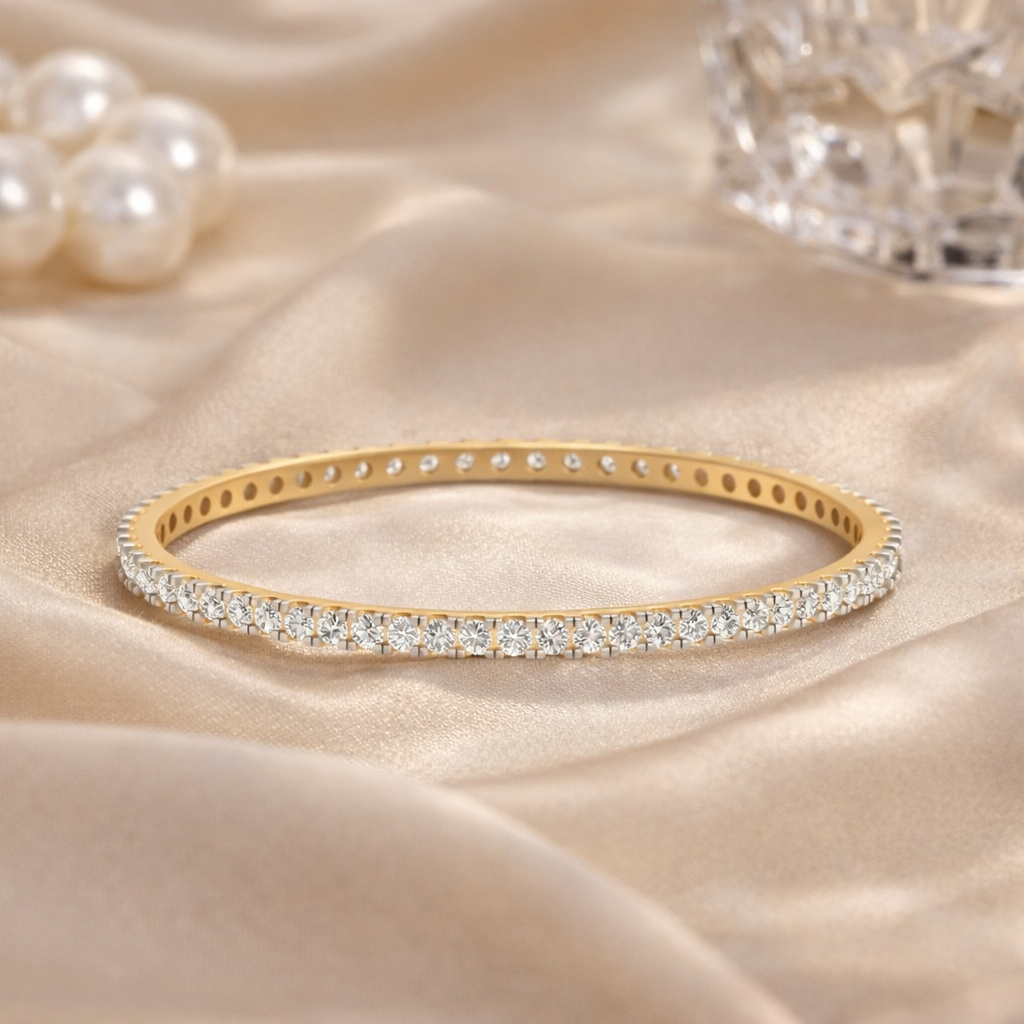 A sleek and timeless bangle crafted in a polished yellow gold finish, featuring a continuous row of sparkling round brilliant-cut lab-grown diamonds set along the outer edge. The clean, minimal design highlights the brilliance of each diamond, while the circular inner gallery allows light to pass through, enhancing the overall sparkle. Elegant and versatile, this refined bangle offers a perfect balance of classic simplicity and modern luxury, making it ideal for everyday elegance as well as special occasions.