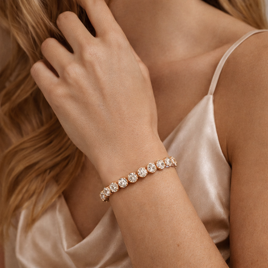 A classic and elegant bracelet featuring a continuous line of sparkling round brilliant-cut lab-grown diamonds set in a refined yellow gold finish. Each diamond is carefully placed to create a seamless flow of brilliance, enhancing the bracelet’s timeless tennis design. The sleek structure and radiant diamonds offer a perfect balance of luxury and sophistication, making it an ideal piece for both everyday elegance and special occasions.