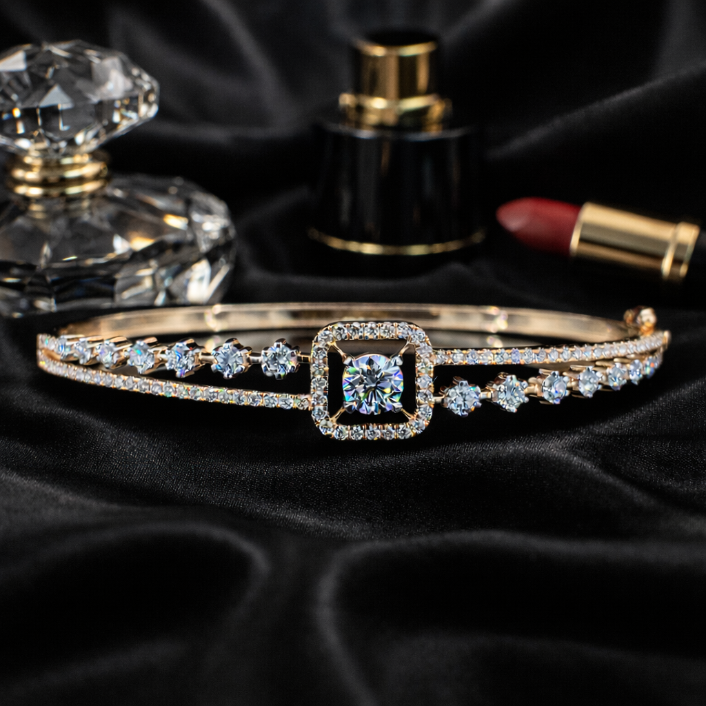 A sophisticated open bracelet featuring a brilliant round-cut lab-grown diamond at the center, framed within a delicate square halo of pavé-set round diamonds. The structured halo design enhances the fire of the center stone, creating a bold yet elegant focal point.