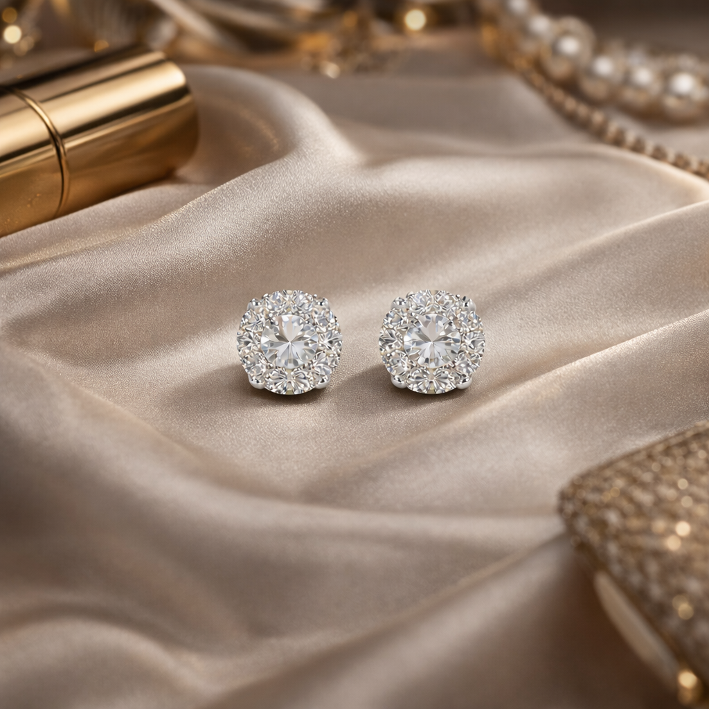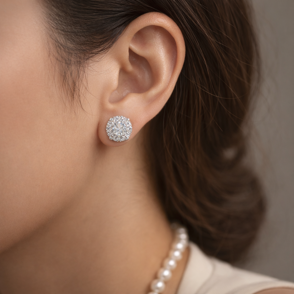 Timeless and elegant, these classic stud earrings feature a brilliant round-cut lab-grown diamond at the center, surrounded by a sparkling halo of smaller diamonds. The halo setting enhances the overall size and brilliance, creating a radiant and refined look.
