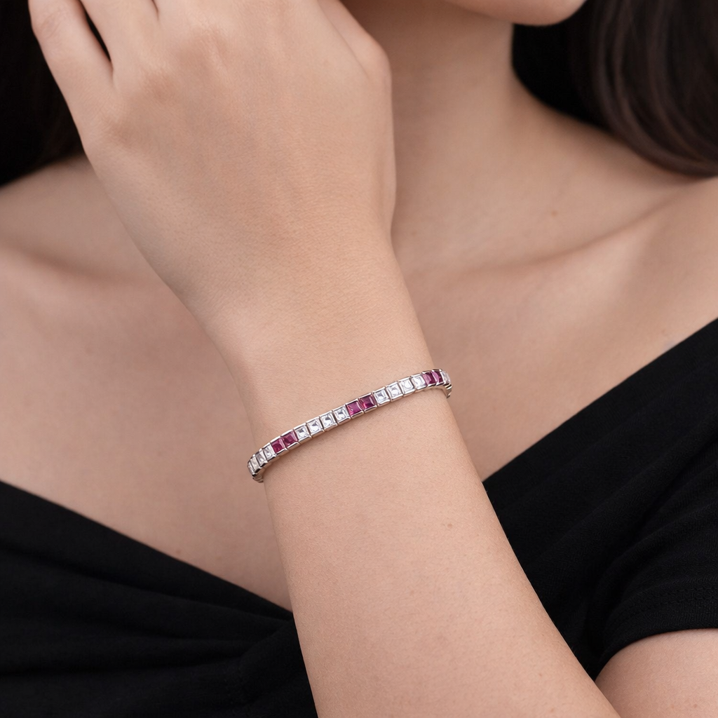 A sleek and sophisticated tennis bracelet featuring precisely set princess-cut lab-grown diamonds accented with vibrant ruby square stones. The clean geometric alignment creates a modern linear silhouette, while the rich pink-red ruby highlights add bold contrast and elegance. Perfect for bridal styling, festive occasions, or refined luxury layering.