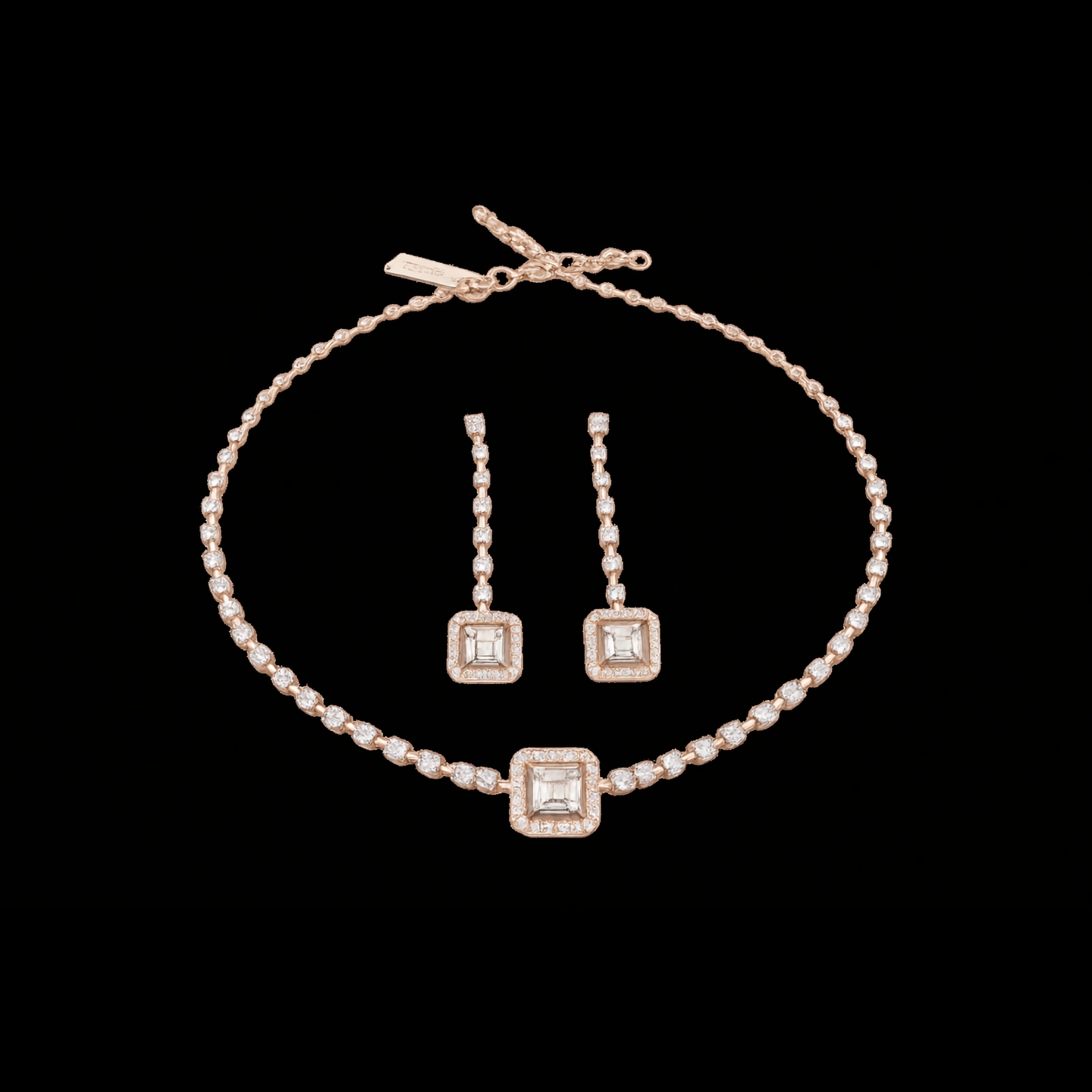 A refined chain necklace set featuring brilliant lab-grown diamonds in a sleek tennis-style arrangement, highlighted by a square halo centerpiece with a structured geometric finish. Paired with matching square drop earrings, this modern and minimal design offers timeless sophistication for evening and formal wear.