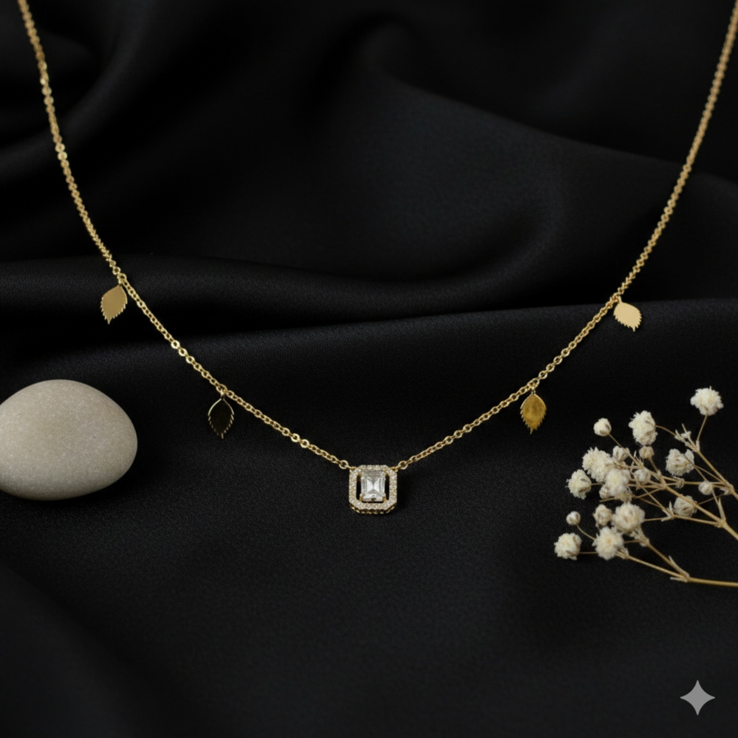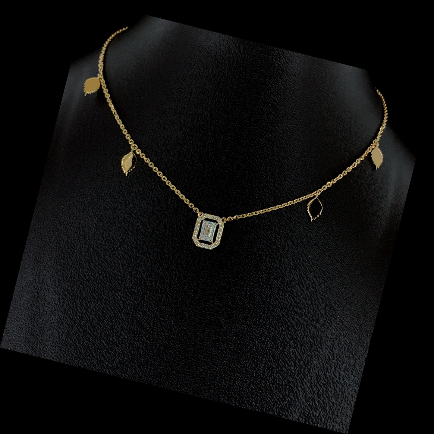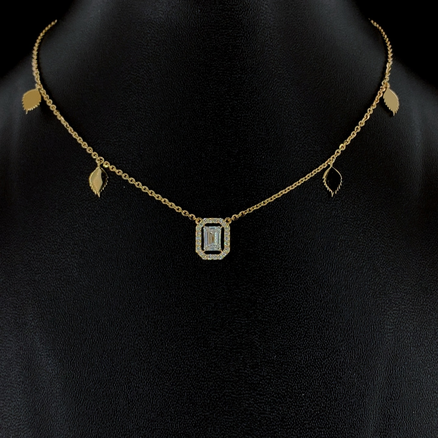 Delicate lab-grown emerald cut diamond necklace featuring a sparkling halo pendant paired with elegant leaf charms along a fine chain. A graceful and modern design perfect for everyday elegance and subtle festive styling.