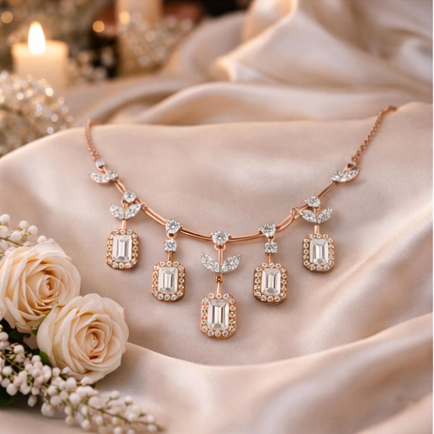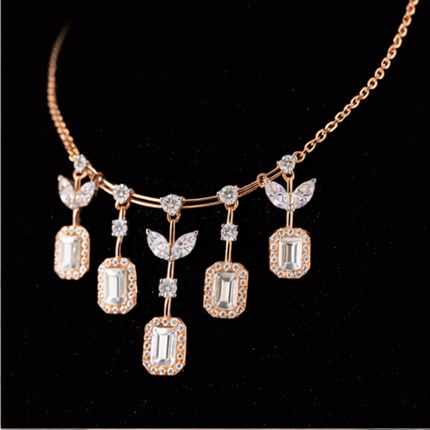 Elegant lab-grown diamond necklace featuring emerald cut diamond drops accented with delicate leaf-inspired details and round diamond connectors. A graceful statement design blending modern geometry with nature elegance.
