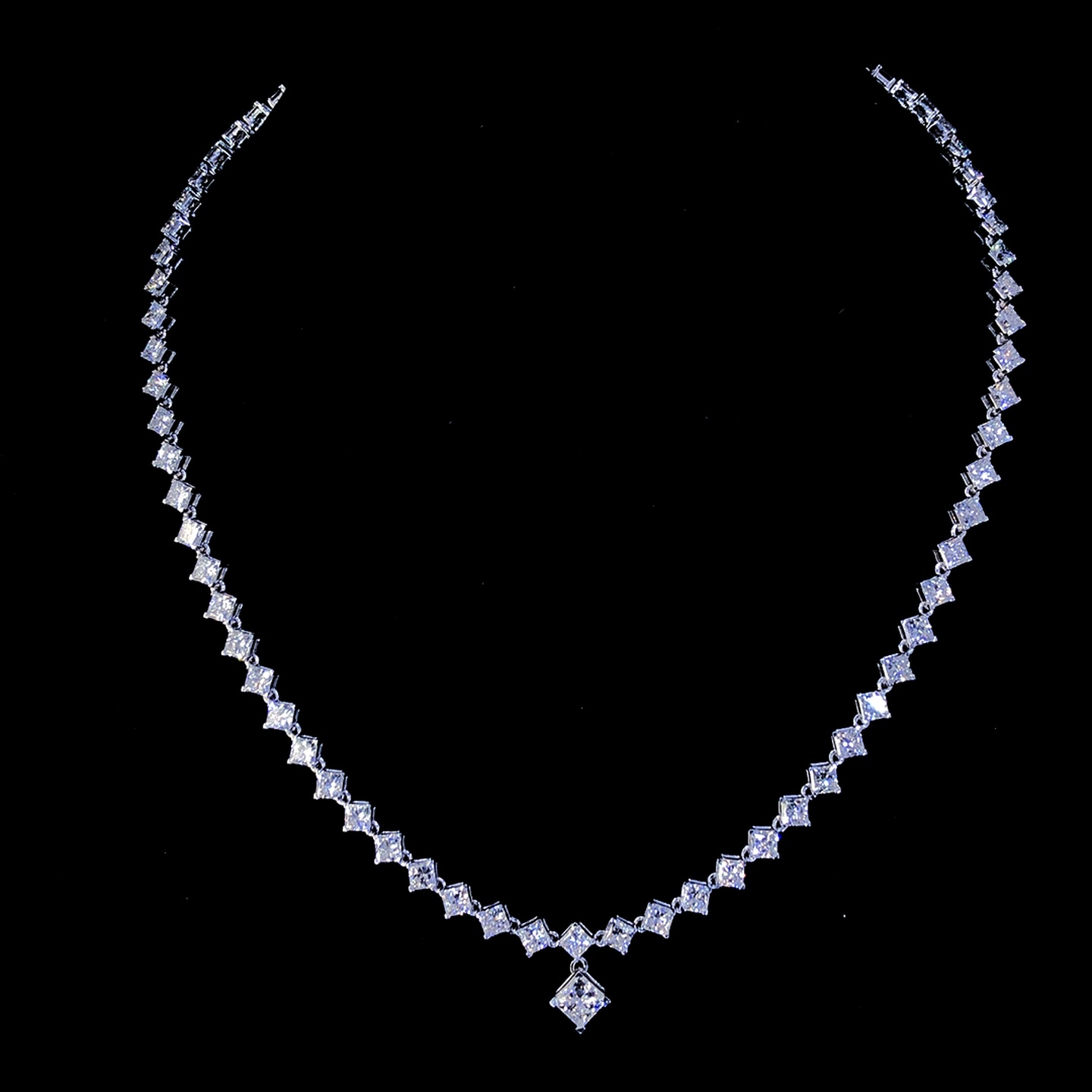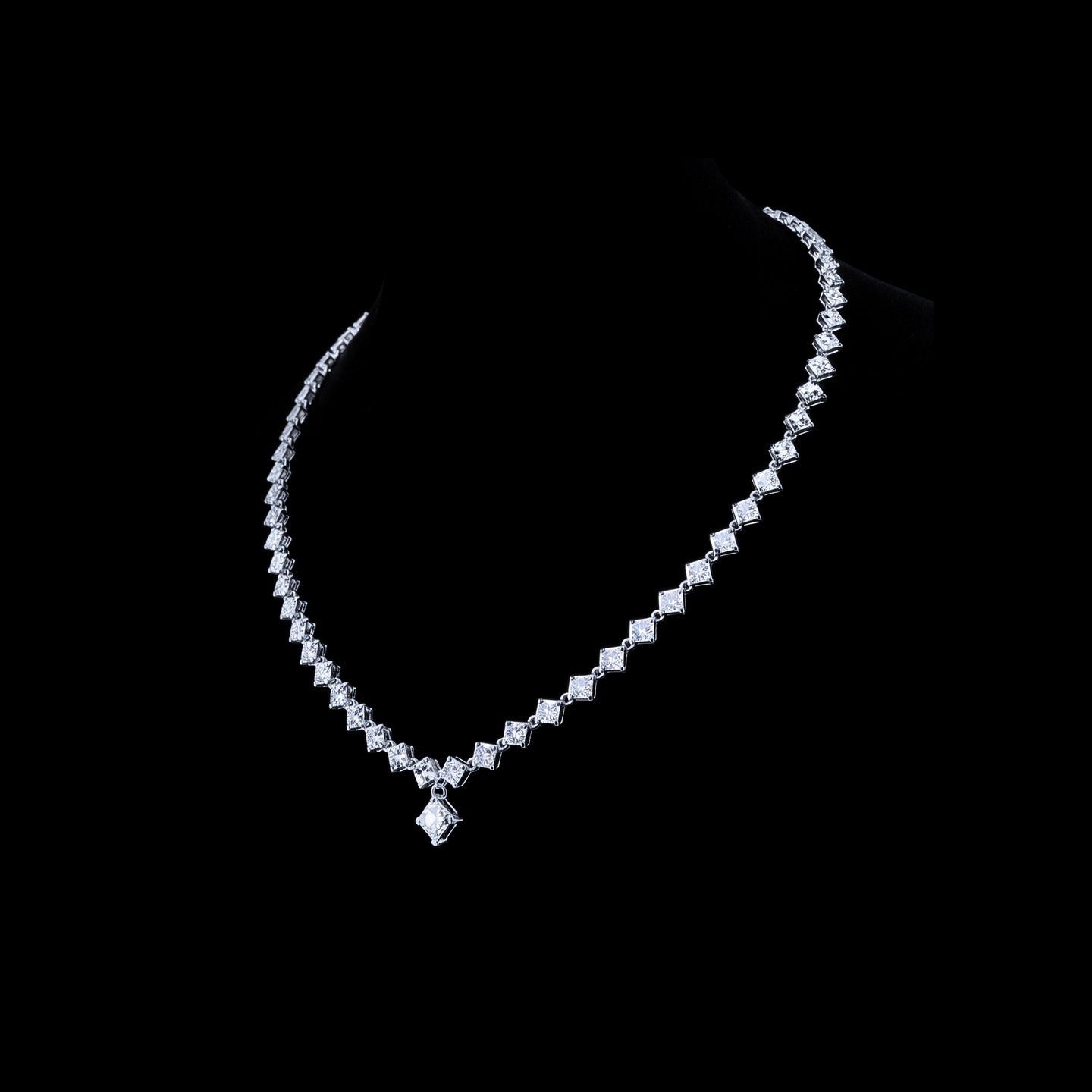 Elegant lab-grown diamond tennis necklace featuring sparkling princess-cut diamond shapes and a graceful drop pendant. Crafted for timeless shine, perfect for weddings, parties, and everyday luxury.