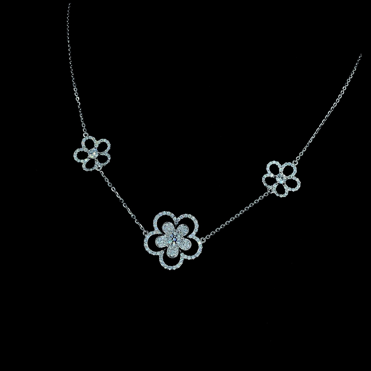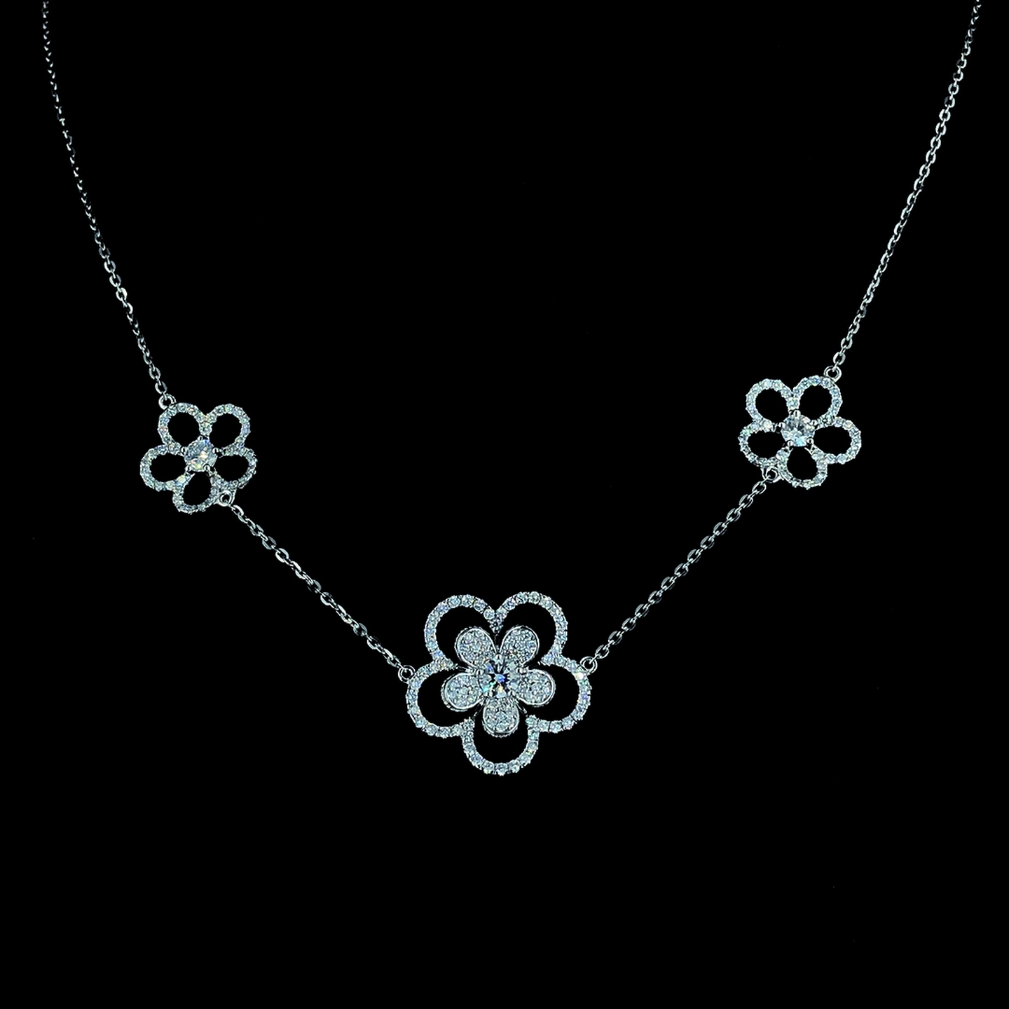 Charming lab-grown round diamond necklace featuring delicate floral designs with sparkling halo detailing. A graceful and feminine piece perfect for everyday elegance, festive occasions, and subtle luxury styling.
